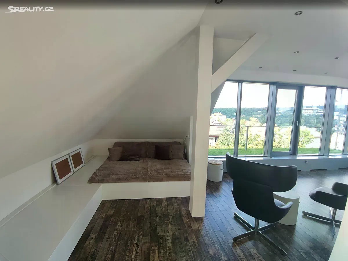 Nabízíme luxusní byt s terasou a balkonem k pronájmu ve vyhledávané lokalitě Cibulka Praha 5. Byt se nachází ve vilové zástavbě, která Vám nabízí nádherné a unikátní výhledy na Prahu a zeleň. Petřín, Smíchov a Pražský hrad. Byt s terasou je elegantně a velmi citlivě navržený tak, aby uspokojil požadavky nejnáročnějšího klienta. Na dokončení interiérů byly pečlivě vybírány ty nejkvalitnější materiály a značkový výrobci nábytku i doplňků, velkoprostorové prosklení, bezfalcové interiérové dveře, nábytek Vitra, koupelna Villeroy & Boch, podlahové vytápění, klimatizace, automatické zastínění venkovními žaluziemi. Vstupní hala a vestavěné skříně nabízí dostatek úložného prostoru. V půdním prostoru je další malé patro jako šatna. Byt je plně zařízený a vybavený nábytkem. Velkým bonusem je privátni zahrada určená k relaxaci o velikosti 300m2. Zahrada je opravdovým bonusem tohoto úžasného bytu. V pěší vzdálenosti jsou Vám k dispozici tenisové kurty přímo v ulici, školky, školy, restaurace, dětská hřiště, venkovní posilovna, obchody a mnoho dalšího. Pěšky se dostaneme do Cibuleckého lesíka. Za 10 minut dojedete do obchodního centra Nový Smíchov a na metro Anděl. Výlet si ale také můžete udělat do oblíbené Zahrady Kinských nebo na Petřín, který je téměř na dosah ruky. Bydlení v klidné vilové čtvrti v zeleni s dosahem do centra za pár minut.
