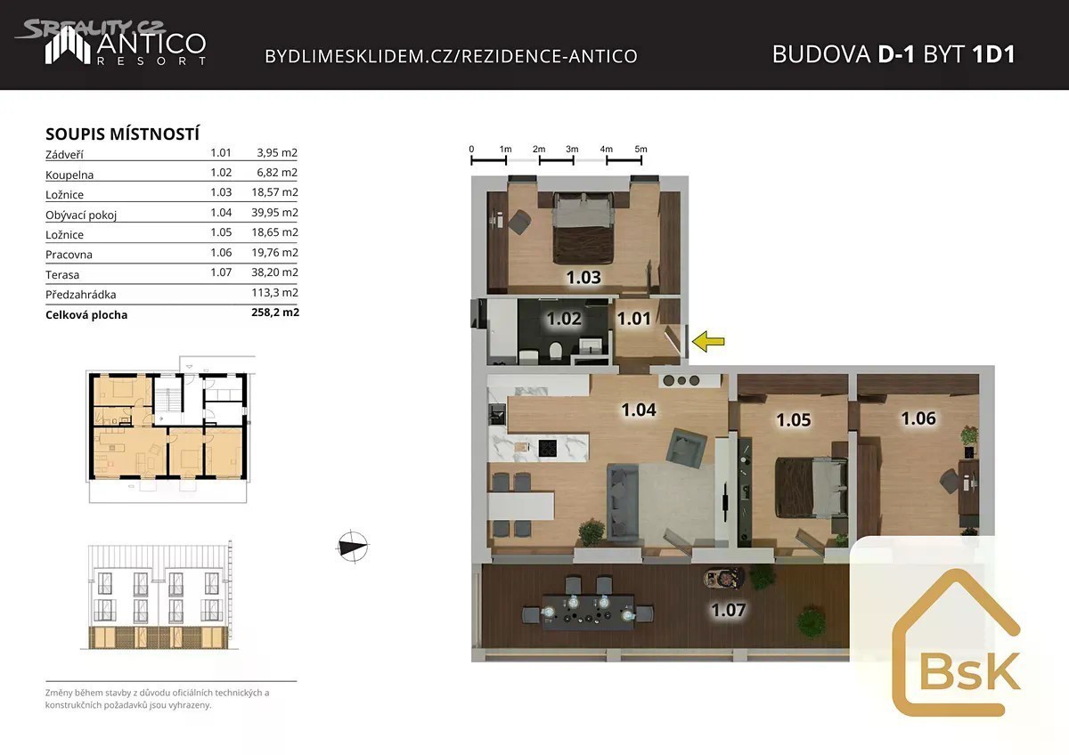 Nabízíme k prodeji moderní a prostorný byt 4+kk o ploše 258,2 m², který se nachází v 1. patře moderního projektu Resort Antico v Českém Brodě s výbornou dostupností do centra města. Tento byt vyniká kvalitními materiály a pečlivým provedením garantujícím komfortní bydlení pro jednotlivce či páry. Byt je chytře dispozičně řešený. Po vstupu do bytu vás přivítá zádveří o velikosti 3,95 m², které poskytuje dostatek prostoru pro úložné skříně a pohodlný přístup do dalších částí bytu. Koupelna o výměře 6,82 m² je vybavena moderními zařizovacími předměty a nabízí ideální místo pro relaxaci po náročném dni. Hlavní obytná místnost s kuchyňským koutem o velikosti 39,95 m² a přímým vstupem na terasu o velikosti 38,20 m² je světlá a vzdušná, což vytváří příjemnou atmosféru pro bydlení. První ložnice o velikosti 18,57 m² nabízí dostatek pohodlí pro spánek či odpočinek. Druhá ložnice je o velikosti 18,65 m² a disponuje vstupem do velkorysé pracovny o velikosti 19,76 m². Jednou z největších předností tohoto bytu je předzahrádka o ploše 113,3 m², která poskytuje skvělé možnosti pro venkovní posezení, zahradničení nebo relaxaci s výhledem na okolí. Projekt Resort Antico vychází z historie místa, kde se dříve nacházel známý truhlářský areál „Antico“. V současnosti zde vzniká rezidenční zástavba citlivě navazující na okolní rodinné domy s dobrou dostupností do centra města. Skládá se ze 6 bytových a 2 vilových domů se 143 bytovými jednotkami různých velikostí a dispozic nabízející široký výběr podle Vašich potřeb. Byty jsou navrženy tak, aby maximálně využívaly prostor a poskytovaly příjemné a moderní prostředí pro život. Otevřený koncept obývacího prostoru s kuchyňským koutem vytváří příjemnou atmosféru. Každá jednotka je vybavena moderními spotřebiči a kvalitními materiály zajišťující dlouhou životnost a vysoký standard bydlení. Velká okna pak poskytnou dostatek přirozeného denního světla. Ke každému bytu nabízíme možnost přikoupit sklepní prostor, podzemní garážové stání, venkovní stání či místo v parkovacím zakladači, kde pohodlně zaparkujete i s SUV. Informace o standardech, umístění jednotky, lokalitě, dopravní dostupnosti do okolních měst včetně Prahy, nabídce služeb či volnočasových aktivit najdete na našich webových stránkách. Odkaz na tyto stránky naleznete níže u developerského projektu Resortu Antico umístěného níže nad kontaktem makléře. Rádi Vám zajistíme financování koupě na míru a komplexně se postaráme o prodej stávající nemovitosti v případě, že budete kupní cenu hradit částečně či zcela úplně právě z prodeje. Přijďte se přesvědčit o kvalitách tohoto jedinečného projektu a objevte svůj nový domov. Těšíme se na Vás na prohlídkách.