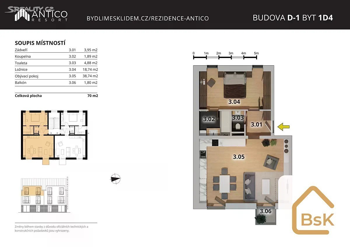 Nabízíme k prodeji moderní a prostorný byt 2+kk o ploše 64,9 m², který se nachází v 2. patře moderního projektu Resort Antico v Českém Brodě s výbornou dostupností do centra města. Tento byt vyniká kvalitními materiály a pečlivým provedením garantujícím komfortní bydlení pro jednotlivce či páry. Byt je chytře dispozičně řešený. Po vstupu do bytu vás přivítá zádveří o velikosti 5,71 m², které poskytuje dostatek prostoru pro úložné skříně a pohodlný přístup do dalších částí bytu. Koupelna o výměře 5,75 m² je vybavena moderními zařizovacími předměty a nabízí ideální místo pro relaxaci po náročném dni. Hlavní obytná místnost s kuchyňským koutem a balkonem o velikosti 33,32 m² je světlá a vzdušná, což vytváří příjemnou atmosféru pro bydlení. Ložnice s druhým balkonem o velikosti 16,52 m² nabízí dostatek pohodlí pro spánek či odpočinek. Projekt Resort Antico vychází z historie místa, kde se dříve nacházel známý truhlářský areál „Antico“. V současnosti zde vzniká rezidenční zástavba citlivě navazující na okolní rodinné domy s dobrou dostupností do centra města. Skládá se ze 6 bytových a 2 vilových domů se 143 bytovými jednotkami různých velikostí a dispozic nabízející široký výběr podle Vašich potřeb. Byty jsou navrženy tak, aby maximálně využívaly prostor a poskytovaly příjemné a moderní prostředí pro život. Otevřený koncept obývacího prostoru s kuchyňským koutem vytváří příjemnou atmosféru. Každá jednotka je vybavena moderními spotřebiči a kvalitními materiály zajišťující dlouhou životnost a vysoký standard bydlení. Velká okna pak poskytnou dostatek přirozeného denního světla. Ke každému bytu nabízíme možnost přikoupit sklepní prostor, podzemní garážové stání, venkovní stání či místo v parkovacím zakladači, kde pohodlně zaparkujete i s SUV. Informace o standardech, umístění jednotky, lokalitě, dopravní dostupnosti do okolních měst včetně Prahy, nabídce služeb či volnočasových aktivit najdete na našich webových stránkách. Odkaz na tyto stránky naleznete níže u developerského projektu Resortu Antico umístěného níže nad kontaktem makléře. Rádi Vám zajistíme financování koupě na míru a komplexně se postaráme o prodej stávající nemovitosti v případě, že budete kupní cenu hradit částečně či zcela úplně právě z prodeje. Přijďte se přesvědčit o kvalitách tohoto jedinečného projektu a objevte svůj nový domov. Těšíme se na Vás na prohlídkách.