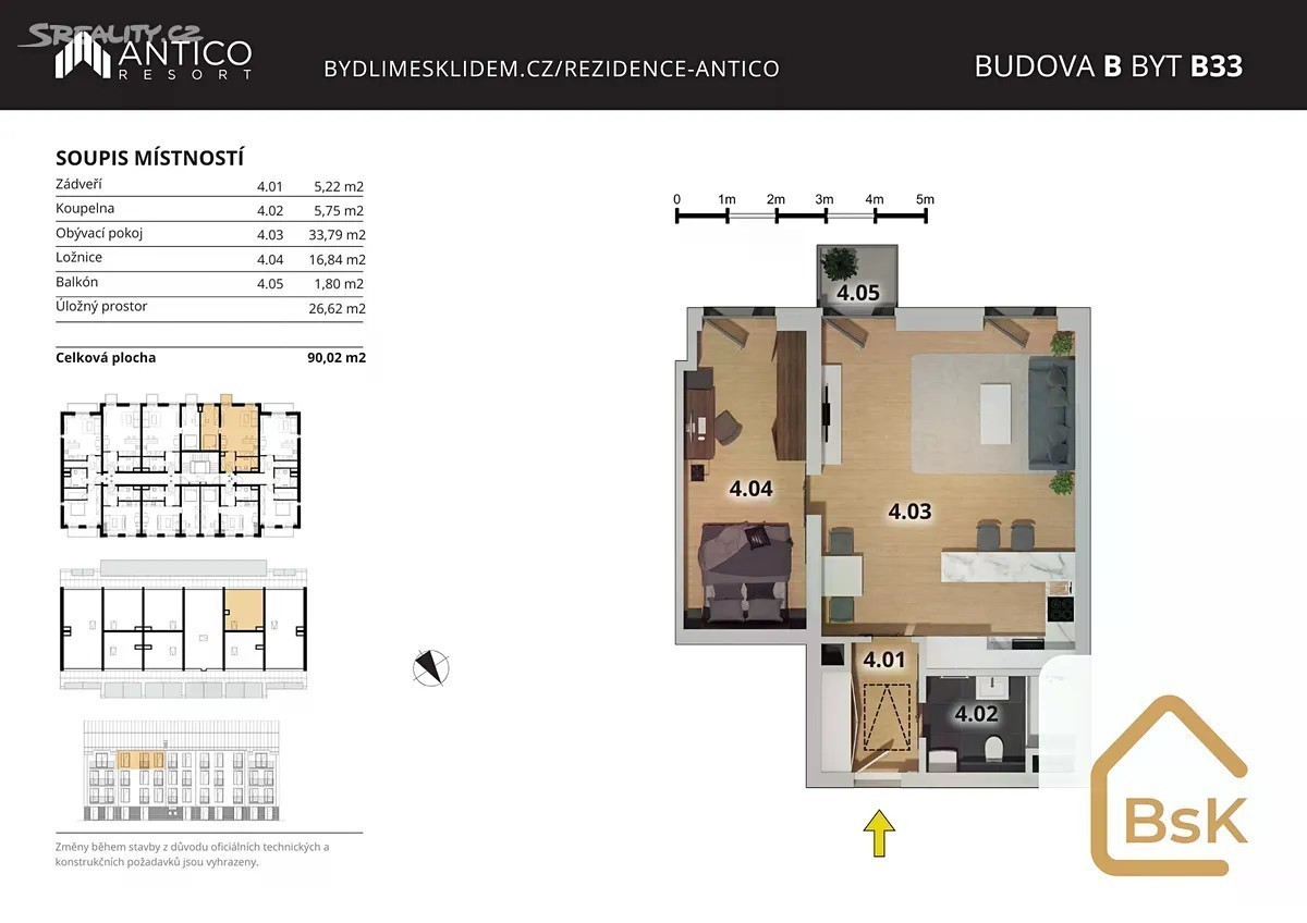 Nabízíme k prodeji moderní a prostorný byt 2+kk o ploše 90,02 m², který se nachází v 4. patře moderního projektu Resort Antico v Českém Brodě s výbornou dostupností do centra města. Tento byt vyniká kvalitními materiály a pečlivým provedením garantujícím komfortní bydlení pro jednotlivce či páry. Byt je chytře dispozičně řešený. Po vstupu do bytu vás přivítá zádveří o velikosti 5,22 m², které poskytuje dostatek prostoru pro úložné skříně a pohodlný přístup do dalších částí bytu. Koupelna o výměře 5,75 m² je vybavena moderními zařizovacími předměty a nabízí ideální místo pro relaxaci po náročném dni. Hlavní obytná místnost s kuchyňským koutem a balkonem o velikosti 33,79 m² je světlá a vzdušná, což vytváří příjemnou atmosféru pro bydlení. Ložnice o ploše 16,84 m² nabízí klidné útočiště a dostatek prostoru pro pohodlné spaní. Úložný prostor o velikosti 26,62 m² je praktickým bonusem, který umožňuje organizované uskladnění vašich věcí a přispívá k celkovému komfortu bydlení. Projekt Resort Antico vychází z historie místa, kde se dříve nacházel známý truhlářský areál „Antico“. V současnosti zde vzniká rezidenční zástavba citlivě navazující na okolní rodinné domy s dobrou dostupností do centra města. Skládá se ze 6 bytových a 2 vilových domů se 143 bytovými jednotkami různých velikostí a dispozic nabízející široký výběr podle Vašich potřeb. Byty jsou navrženy tak, aby maximálně využívaly prostor a poskytovaly příjemné a moderní prostředí pro život. Otevřený koncept obývacího prostoru s kuchyňským koutem vytváří příjemnou atmosféru. Každá jednotka je vybavena moderními spotřebiči a kvalitními materiály zajišťující dlouhou životnost a vysoký standard bydlení. Velká okna pak poskytnou dostatek přirozeného denního světla. Ke každému bytu nabízíme možnost přikoupit sklepní prostor, podzemní garážové stání, venkovní stání či místo v parkovacím zakladači, kde pohodlně zaparkujete i s SUV. Informace o standardech, umístění jednotky, lokalitě, dopravní dostupnosti do okolních měst včetně Prahy, nabídce služeb či volnočasových aktivit najdete na našich webových stránkách. Odkaz na tyto stránky naleznete níže u developerského projektu Resortu Antico umístěného níže nad kontaktem makléře. Rádi Vám zajistíme financování koupě na míru a komplexně se postaráme o prodej stávající nemovitosti v případě, že budete kupní cenu hradit částečně či zcela úplně právě z prodeje. Přijďte se přesvědčit o kvalitách tohoto jedinečného projektu a objevte svůj nový domov. Těšíme se na Vás na prohlídkách.