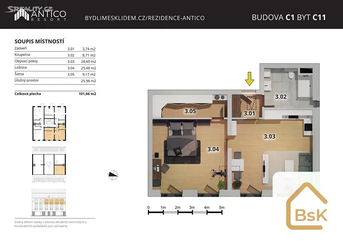 Nabízíme k prodeji moderní a prostorný byt 2+kk o ploše 101,66 m², který se nachází v 3. patře moderního projektu Resort Antico v Českém Brodě s výbornou dostupností do centra města. Tento byt vyniká kvalitními materiály a pečlivým provedením garantujícím komfortní bydlení pro jednotlivce či páry. Byt je chytře dispozičně řešený. Po vstupu do bytu vás přivítá zádveří o velikosti 3,74m², které poskytuje dostatek prostoru pro úložné skříně a pohodlný přístup do dalších částí bytu. Koupelna o výměře 8,71 m² je vybavena moderními zařizovacími předměty a nabízí ideální místo pro relaxaci po náročném dni. Hlavní obytná místnost s kuchyňským koutem o velikosti 28,60 m² a je světlá a vzdušná, což vytváří příjemnou atmosféru pro bydlení. Ložnice o velikosti 25,48 m² nabízí dostatek pohodlí pro spánek či odpočinek. K uskladnění oblečení je připravena šatna o výměře 9,17 m². Významným benefitem je úložný prostor o rozměru 29,96 m², který může sloužit jako sklad. Projekt Resort Antico vychází z historie místa, kde se dříve nacházel známý truhlářský areál „Antico“. V současnosti zde vzniká rezidenční zástavba citlivě navazující na okolní rodinné domy s dobrou dostupností do centra města. Skládá se ze 6 bytových a 2 vilových domů se 143 bytovými jednotkami různých velikostí a dispozic nabízející široký výběr podle Vašich potřeb. Byty jsou navrženy tak, aby maximálně využívaly prostor a poskytovaly příjemné a moderní prostředí pro život. Otevřený koncept obývacího prostoru s kuchyňským koutem vytváří příjemnou atmosféru. Každá jednotka je vybavena moderními spotřebiči a kvalitními materiály zajišťující dlouhou životnost a vysoký standard bydlení. Velká okna pak poskytnou dostatek přirozeného denního světla. Ke každému bytu nabízíme možnost přikoupit sklepní prostor, podzemní garážové stání, venkovní stání či místo v parkovacím zakladači, kde pohodlně zaparkujete i s SUV. Informace o standardech, umístění jednotky, lokalitě, dopravní dostupnosti do okolních měst včetně Prahy, nabídce služeb či volnočasových aktivit najdete na našich webových stránkách. Odkaz na tyto stránky naleznete níže u developerského projektu Resortu Antico umístěného níže nad kontaktem makléře. Rádi Vám zajistíme financování koupě na míru a komplexně se postaráme o prodej stávající nemovitosti v případě, že budete kupní cenu hradit částečně či zcela úplně právě z prodeje. Přijďte se přesvědčit o kvalitách tohoto jedinečného projektu a objevte svůj nový domov. Těšíme se na Vás na prohlídkách.
