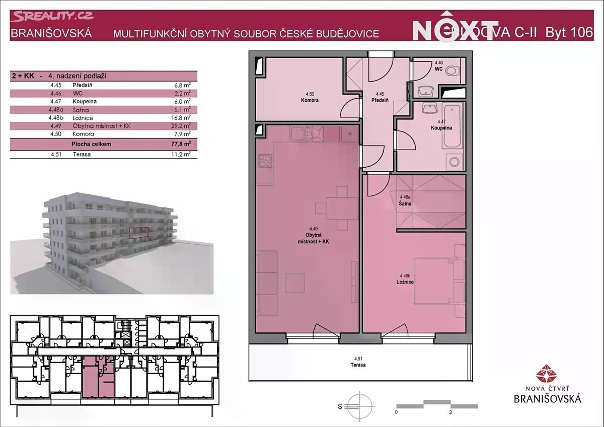 Exkluzivně nabízíme k pronájmu luxusní byt 2+kk o celkové ploše 77,8 m², situovaný ve čtvrtém nadzemním podlaží moderního bytového domu s celkem šesti podlažími. Byt je orientován na západ, což mu zajišťuje dostatek odpoledního světla, a díky umístění v druhé budově nabízí klidný výhled do vnitrobloku, na upravenou zahradu i okolní přírodu. Po vstupu vás přivítá předsíň o velikosti 6,8 m², která poskytuje prostor pro šatní skříň či botník s věšákem. Na předsíň navazuje samostatné WC o velikosti 2,2 m² a koupelna o velikosti 6,0 m², laděná do moderní kombinace bílé a přírodního dřeva. Další místností je komora/šatna o velikosti 5,1 m² - praktický prostor, který lze využít nejen na uskladnění věcí, ale i jako menší domácí posilovnu, hernu či cvičební koutek. Ložnice o velikosti 16,8 m² má oddělený prostor na šatnu a nabízí přímý vstup na terasu. Hlavní obytná místnost s kuchyňským koutem o ploše 29,2 m² působí vzdušně a prostorně a rovněž disponuje vstupem na terasu. Komora o velikosti 7,9 m² rozšiřuje úložné možnosti a dodává bytu mimořádnou praktičnost. Terasa o velikosti 11,2 m² je skutečnou dominantou bytu - poskytuje příjemný výhled na zeleň vnitrobloku i na okolní krajinu a stává se dalším obytným prostorem, kde si můžete užít klidné večery či posezení s přáteli. Kuchyňský kout je již ve výrobě a bude kompletně osazen v průběhu října, nejpozději počátkem listopadu. Byt tak bude připraven k nastěhování od konce listopadu či začátku prosince. Byt díky své promyšlené dispozici působí větší, než by samotná dispozice 2+kk napovídala, a kombinuje moderní styl s funkčními prvky, které ocení každý náročný nájemce. Samozřejmostí je parkovací stání v garáži, které k bytu náleží, a kompletní občanská vybavenost v okolí - od školek a škol přes obchody až po nákupní centrum Čtyři Dvory. Poloha na konci Branišovské zajišťuje klid, snadný přístup k přírodě i sportovním možnostem, a zároveň výbornou dostupnost do centra Českých Budějovic - ať už autem nebo MHD. České Budějovice jako univerzitní město pak nabízejí bohatý kulturní a společenský život, restaurace, kavárny a historické centrum s neopakovatelnou atmosférou. Tento byt je ideální pro ty, kteří hledají moderní, luxusní a přitom praktické bydlení v atraktivní lokalitě. Finanční podmínky pronájmu: Nájemné činí 21 500 Kč měsíčně, parkovací stání v garáži 1 500 Kč měsíčně. Zálohy na služby a energie jsou ve výši 3 500 Kč měsíčně, elektřina se převádí přímo na nájemce (cca 1 000 Kč měsíčně). Při podpisu smlouvy se skládají dvě kauce. Pro komunikaci uvádějte evidenční číslo zakázky N114047.