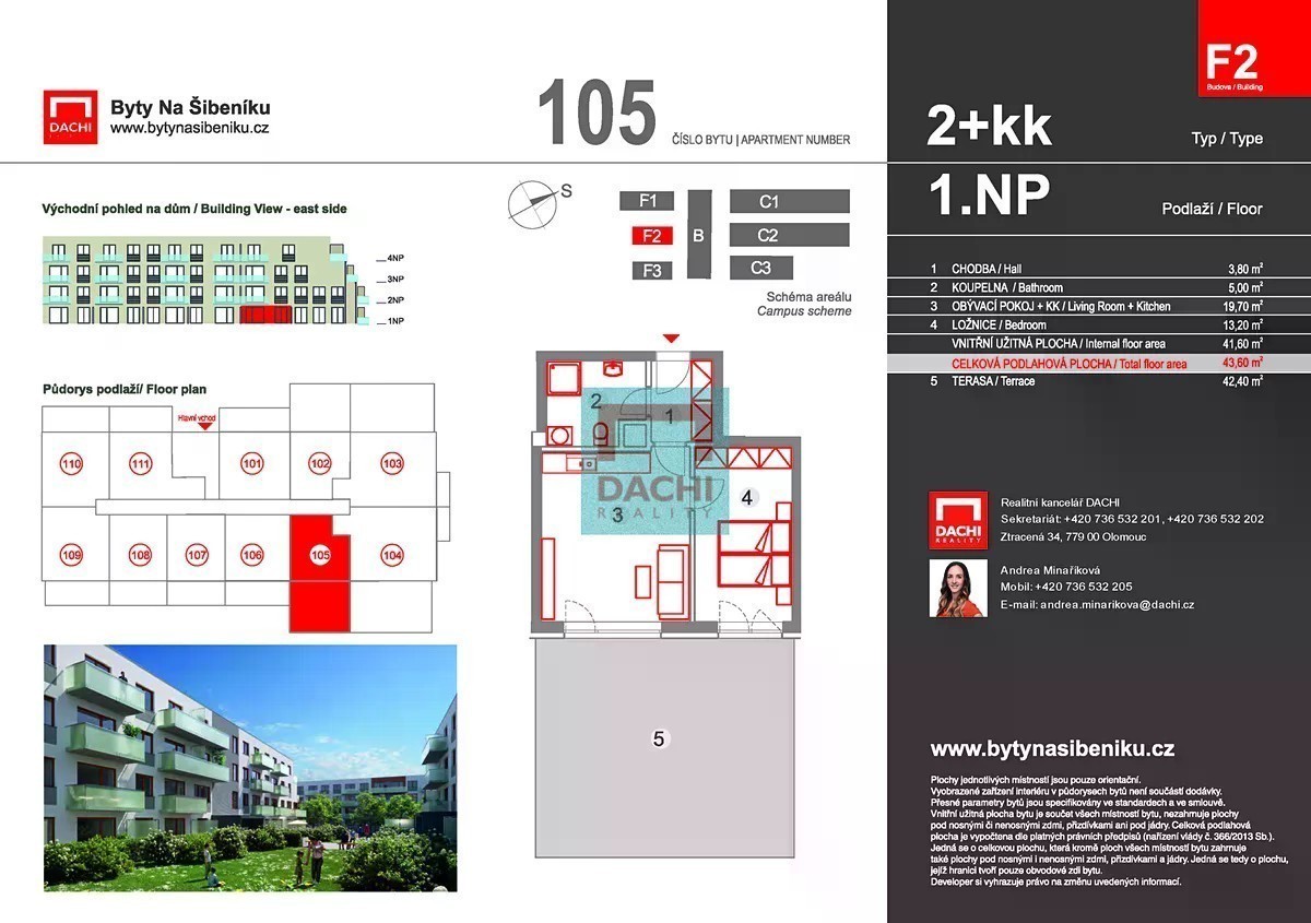 Moderní bydlení na Šibeníku - II. etapa Navazujeme na úspěch první etapy a přinášíme vám jedinečnou příležitost pořídit si nový domov v atraktivním projektu Byty Na Šibeníku. DACHI, prodejce a partner developera, vám v rámci druhé etapy nabízí ke koupi byt 2+kk (č. 102) o ploše 43,6 m² s terasou o velikosti 40 m². Byt se nachází v 1. nadzemním podlaží bytového domu F2, který je součástí šestipodlažního objektu se čtyřmi nadzemními a dvěma podzemními podlažími. Součástí projektu je možnost dokoupení parkovacího stání nebo komory, což zvyšuje komfort bydlení. Byty jsou nabízeny ve vysokém standardu vybavení včetně předokenních žaluzií a vyznačují se promyšleným dispozičním řešením, které uspokojí i náročné klienty. Pokud hledáte ideální financování, naše hypoteční centrum vám pomůže vybrat nejvýhodnější variantu na míru vašim potřebám. Pro lepší představu o kvalitě projektu doporučujeme domluvit si schůzku s naším realitním poradcem a navštívit vzorový byt, kde si můžete prohlédnout kvalitu zpracování a detaily projektu. Výstavba projektu byla zahájena v prvním čtvrtletí roku 2023 a dokončení je plánováno na začátek roku 2026, kdy se budete moci do svého nového domova nastěhovat. Nezmeškejte tuto příležitost a staňte se součástí moderního bydlení na Šibeníku.