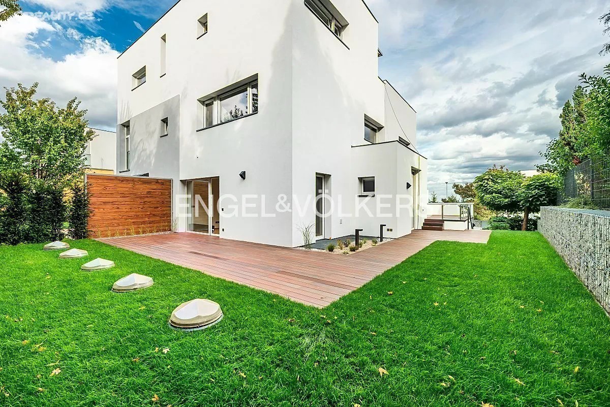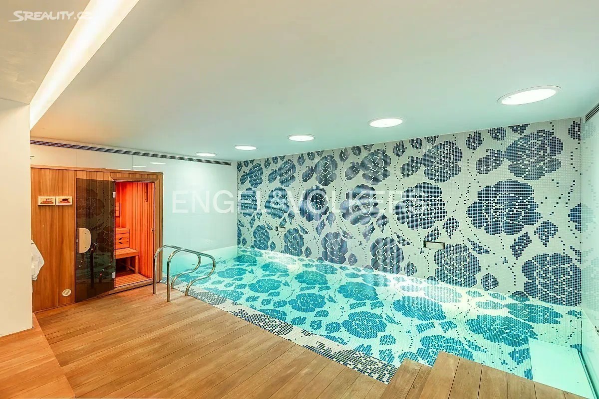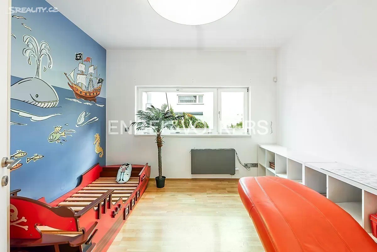 Přinášíme Vám k pronájmu rodinný dům ve vysokém standardu s dispozicí 6+kk, se zahradou a vnitřním bazénem, v exkluzivní lokalitě pražské Hanspaulky. Dům se skládá z 5 samostatných ložnic, obývacího pokoje s kuchyňským koutem, 4 koupelen, garáže a vnitřního bazénu se saunou. Po vstupu do přízemí se nachází zádveří se samostatnou toaletou. Dále zde najdeme prostorný obývací pokoj s kuchyňským koutem, který je plně vybaven spotřebiči Miele včetně kávovaru, konvektomatu a vinotéky. Z obývacího pokoje je přístup na zahradu s terasou. Zahrada je vybavena bezúdržbovým systémem. V prvním patře se nacházejí 3 samostatné ložnice - hostinský pokoj, dětský pokoj a manželská ložnice - společně se dvěma koupelnami. Na chodbě v tomto patře jsou vestavěné skříně. V posledním patře se nachází samostatná ložnice, která může sloužit také jako pracovna, s další koupelnou. Z této ložnice je přístup na prostornou terasu s nábytkem a úžasným výhledem na Pražský hrad a Tróju. V prvním podzemním podlaží se nachází dominanta celého domu - vnitřní bazén se saunou. Bazén má profesionální systém chlorování a čištění. V tomto podlaží se nachází také samostatný byt s koupelnou, ideální například pro hospodyni. V chodbě je dostatek vestavěných skříní. Garáž disponuje dvěma parkovacími stáními a nabíječkami na elektromobil 10-20 kW. Před garáží je prostor pro další tři auta. Elektřina činí přibližně 10 000 Kč a plyn 7 000 Kč.