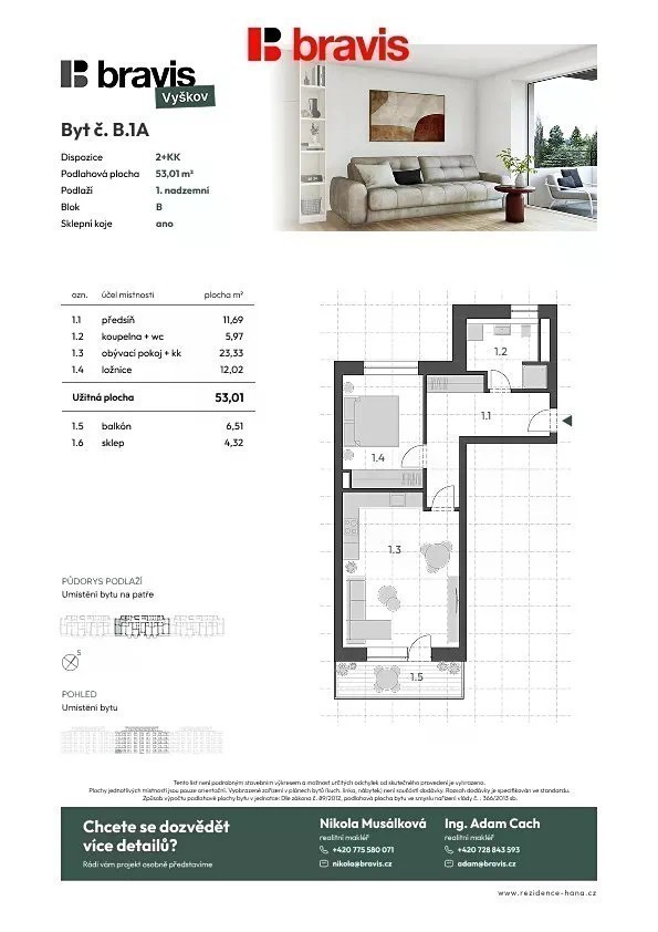 PRODEJ NOVÝCH BYTŮ VE VYŠKOVĚ ZAHÁJEN! Hledáte nové a moderní bydlení v klidné lokalitě, ale zároveň v blízkosti centra města Vyškov? Právě jste našli Váš vysněný byt! V rámci nového developerského projektu Rezidence Haná u řeky Haná nabízíme k prodeji byt o dispozici 2+kk, označený C.1A, s užitnou plochou 53 m². Byt se nachází v 1. nadzemním podlaží moderního domu, který je v současné době ve výstavbě a garantuje vše, co očekáváte od současného bydlení té nejvyšší úrovně. Co na vás v tomto bytě čeká? Velkorysá předsíň (11,69 m²) - prostor vhodný pro vestavné skříně, botníky i další úložné řešení dle vlastních představ. Moderně řešená koupelna s WC (5,97 m²) - důraz na komfort a praktičnost. Obývací pokoj s kuchyňským koutem (23,33 m²) - prosluněný pokoj poskytuje skvělé místo pro relaxaci i návštěvy, navíc s přímým vstupem na balkon. Ložnice (12,02 m²) - klidná zóna pro odpočinek i relaxaci po dlouhém dni. Prostorný balkon (6,51 m²) - ideální místo pro ranní kávu, odpolední posezení nebo rozkvetlou bylinkovou zahrádku. Sklepní kóje (4,84 m²) - prostor pro sportovní vybavení, sezónní věci nebo cokoliv dalšího, co potřebujete mít po ruce. Výjimečné výhody projektu Rezidence Haná: Novostavba s energetickou třídou A, maximální důraz na kvalitu a úspornost. Široké spektrum materiálů a nadčasových dekorů v rámci standardu. Designové koupelnové vybavení a dlažby, kvalitní rigidní vinylová podlaha zajišťující komfort a dlouhou životnost. Optické internetové připojení, stylové elektrické zásuvky a světla. Příprava pro předokenní žaluzie pro ještě vyšší úroveň komfortu a bezpečí. Topení s možností regulace díky termostatickým hlavicím. Možnost klientských změn - byt si můžete upravit přesně podle svých potřeb a vkusu. Součástí ceny je sklepní kóje! Bude vybudováno velkokapacitní veřejné parkoviště u domu, ale k bytu můžete dokoupit či pronajmout i vlastní parkovací místo. Lokalita - to nejlepší z Vyškova: Projekt se nachází v žádané části Vyškova - Předměstí a v pěší dostupnosti samotného centra města. V okolí najdete opravdu veškerou občanskou vybavenost: školy, školky, obchody, kavárny, restaurace, kino, lékaře i zastávky městské hromadné dopravy. Pro dojíždějící je skvělou zprávou rychlé napojení na D1, Brno je tedy v blízkosti. Rezidence Haná - místo, kde se budete cítit opravdu doma Projekt tvoří 70 bytových jednotek, což zaručuje příjemné sousedské prostředí, dostatek soukromí, klidu i pohodlí. Kvalitu bydlení podtrhuje výstavba pomocí nejmodernějších technologií, které myslí nejen na současnost, ale i na budoucnost a dlouhodobou spokojenost všech obyvatel. Tento byt je díky svým parametrům i lokalitě vhodný nejen pro vlastní pohodlné bydlení, ale rovněž jako skvělá investiční příležitost. Nemovitosti v této části Vyškova mají velký potenciál do budoucna! Neváhejte a staňte se součástí unikátního projektu, kde je moderní životní styl samozřejmostí! Pokud Vás tento byt zaujla, neváhejte kontaktovat uvedeného makléře.