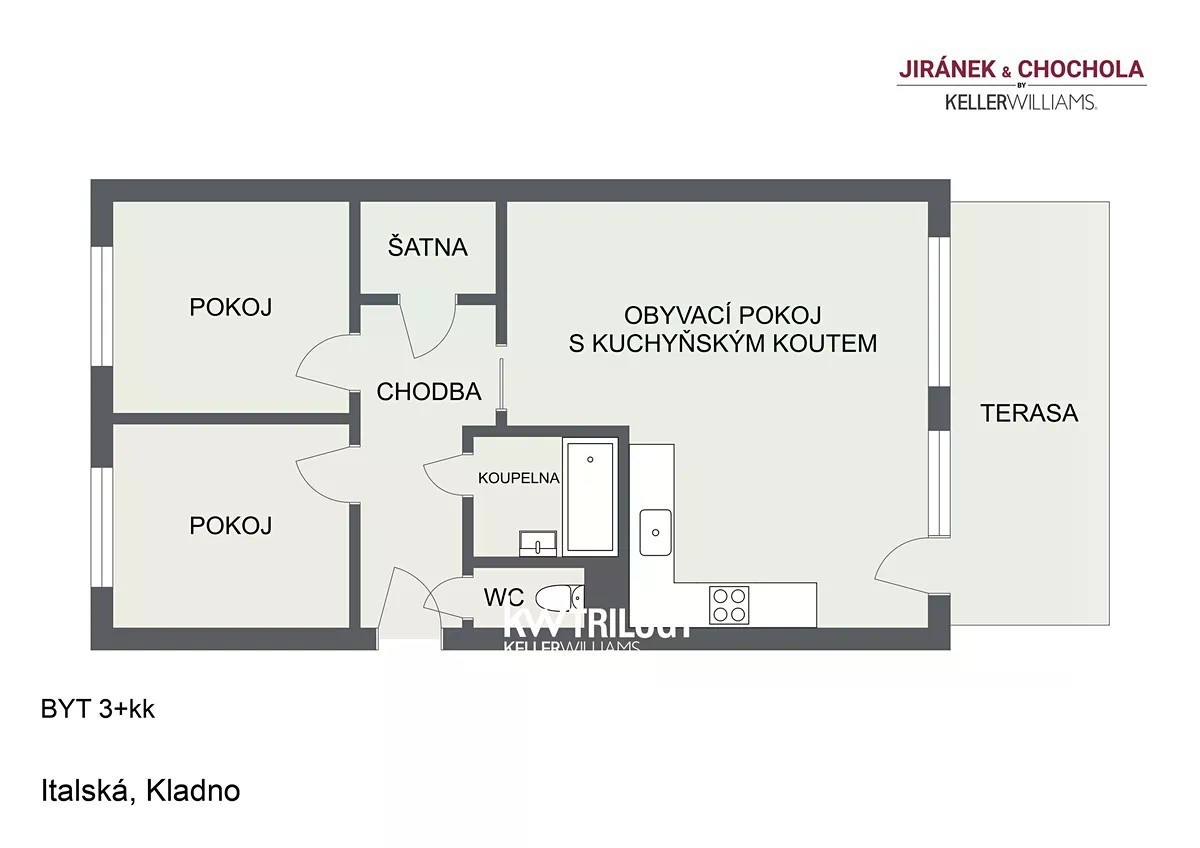 Nabízíme k prodeji byt o dispozici 3+kk s prostornou terasou v ulici Italská, Kladno - Kročehlavy. Užitná plocha je 61 m², k tomu terasa o výměře 15 m² a sklepní kóje. Byt prošel rekonstrukcí - rozvody vody a odpadů, elektroinstalace, plastová okna, plovoucí podlahy, dlažba, kuchyňská linka, příčky i stěrky. Součástí je také praktická šatna. Dispozice - Obývací pokoj s kuchyňským koutem a vstupem na terasu - Dva samostatné pokoje - Koupelna s vanou, samostatné WC - Šatna a chodba Panelový dům je po revitalizaci - nová plastová okna, stoupačky, zateplená fasáda, střecha i výtah. Lokalita Byt se nachází v atraktivní části Kladna - Kročehlav, s kompletní občanskou vybaveností v bezprostřední blízkosti. V docházkové vzdálenosti jsou supermarkety, restaurace, čerpací stanice, dětské hřiště i vlakové nádraží Kladno. Tato nemovitost je ideální jak pro vlastní bydlení, tak jako investice. Pro více informací nebo sjednání prohlídky nás neváhejte kontaktovat. Uvedené výměry jsou orientační. V případě více zájemců bude nemovitost prodána nejlepší nabídce a majitel si vyhrazuje právo vybrat kupujícího na základě jim zvolených kritérií. Veškeré zveřejněné údaje obsažené v tomto inzerátu mají pouze informativní charakter a nejsou nabídkou ve smyslu § 1731 nebo § 1732 občanského zákoníku, ani se nejedná o veřejný příslib dle § 1733 občanského zákoníku.