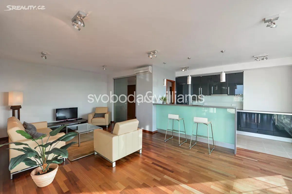 Stylový, moderní a plně klimatizovaný zařízený byt s terasou a úžasným výhledem na Pražský hrad a Staré Město v 1. patře komplexu s 24hodinovou recepcí, bezpečnostními kamerami a správcovskou službou Rezidence Riegrovy sady situovaného přímo u parku, pár minut od Václavského náměstí. Byt nabízí plně vybavený kuchyňský kout s barovým pultem, obývací pokoj s jídelním prostorem a velkými francouzskými okny vedoucími na terasu (11 m2) a balkón (5 m2), 3 ložnice, 2 koupelny (jednu s vířivou vanou, sprchovým koutem a toaletou, druhou se sprchovým koutem a toaletou). Podlahy z masivu a dlažba, vysoké interiérové dveře, termoizolační okna se žaluziemi, pračka, sušička, myčka, mikrovlnná trouba, plynové topení, satelitní TV připojení, video intercom, příprava na alarm. Možnost posezení na společné zahradě. Parkování v podzemní garáži za 5.000 Kč/měs. plus parkování pro hosty na pozemku.