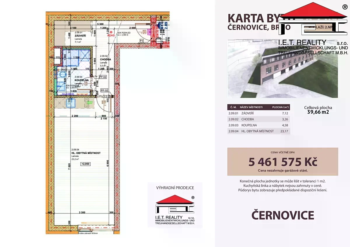 Nabízíme k prodeji nový byt s označením 2.09 o dispozici 1+kk v právě vznikajícím projektu Bytový dům Faměrovo náměstí v Brně. Byt o celkové výměře 39,66 m² se nachází v moderní novostavbě s důrazem na kvalitní provedení, funkční dispozice a moderní městské bydlení. K bytu dále náleží jedno parkovací místo v 1.NP tohoto bytového domu za cenu 583.245,- Kč, které není součástí kupní ceny. Po dohodě lze zakoupit i více parkovacích míst. Termín dokončení 12/2026. Interiér bytu je navržen v nadčasovém stylu s příjemnými přírodními tóny. Podlahy obytných místností pokrývá vinyl v dekoru dubového dřeva, koupelna a WC jsou obloženy keramickou dlažbou v decentních odstínech šedé s designem betonu. Koupelna je vybavena sprchovým koutem s bezpečnostním sklem, závěsným WC systémem Geberit a moderní černou sanitou značky Nobless. Vstupní dveře jsou bezpečnostní, protipožární, v antracitovém provedení, vnitřní dveře bílé s lakovaným povrchem. Byt má připravené vývody pro kuchyňskou linku (elektřina, voda, kanalizace), centrální vytápění s vlastním měřením a přípravu pro internet a domácí telefon. Samotný dům je navržen jako moderní betonová stavba s kvalitní fasádou a extenzivní zelenou střechou. Společné prostory jsou provedeny ve vysokém standardu - keramická dlažba, sádrové omítky, osvětlení na pohybová čidla, kolárna, technická místnost a samostatně řešená místnost pro odpad přímo v domě. V rámci projektu jsou k dispozici také garážová stání s dálkovým ovládáním. Lokalita nabízí klidné městské bydlení s výbornou dopravní dostupností a kompletní občanskou vybaveností v bezprostředním okolí. Projekt je vhodný pro vlastní bydlení i jako výhodná investice.