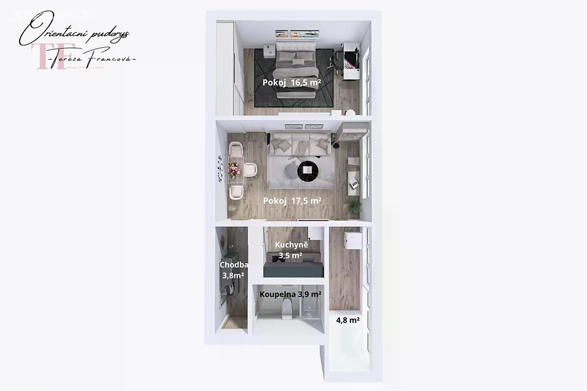 Nabízím k prodeji světlý a prakticky řešený byt o dispozici 2+kk s uzavřenou lodžií, který se nachází v prvním patře cihlového domu s výtahem v žádané lokalitě Brno - Tábor. Celková plocha bytu činí 49 m² a díky chytrému dispozičnímu řešení nabízí dostatek prostoru jak pro vlastní bydlení, tak i pro investici na pronájem. Dominantou bytu je prostorný obývací pokoj s kuchyňským koutem, kde je možné umístit jídelní stůl, rohovou sedačku i obývací stěnu. Na něj navazuje samostatná ložnice, která poskytuje klidné zázemí pro odpočinek. Velkou výhodou je zazděná lodžie, která je díky velkým oknům světlá a funkčně využitelná jako pracovna, malá dětská herna nebo malý pokoj pro hosty. Koupelna je vybavena vanou a toaletou, přičemž je zde prostor i pro pračku. Dispozici doplňuje vstupní chodba s možností umístění vestavěných skříní. Byt je v udržovaném stavu a nabízí možnost úprav dle vlastních představ. V roce 2018 byla kompletně předělána elektroinstalace do mědi. O vytápění a ohřev vody se stará úsporný kondenzační kotel (7 let), komfort v letních měsících zajišťuje klimatizace s možností přitápění. Samotný dům je cihlové konstrukce, v posledních letech prošel modernizací - byla zrekonstruována střecha a vyměněna elektroinstalace ve společných prostorách. K bytu náleží také sklepní kóje. Lokalita Brno - Tábor patří mezi vyhledávané adresy díky skvělé dostupnosti do centra města a kompletní občanské vybavenosti v okolí. V docházkové vzdálenosti najdete obchody, kavárny, restaurace, školu, školku, zdravotní středisko i sportoviště. Zastávky MHD jsou jen pár minut pěšky a zajišťují rychlé spojení s centrem Brna. V okolí nechybí ani parky a zelené plochy vhodné pro relaxaci nebo sport. Byt je vhodný jak pro vlastní bydlení, tak jako zajímavá investiční příležitost. Shrnutí - hlavní přednosti bytu - dispozice 2+kk rozšířená o uzavřenou lodžii využitelnou jako malý pokoj - celková plocha 49 m² - patro cihlového domu s výtahem - sklepní kóje - elektroinstalace v mědi (2018) - úsporný kondenzační kotel + klimatizace s možností topení - dům po částečné rekonstrukci (střecha, elektroinstalace ve společných prostorách) - velmi nízké provozní náklady (cca 5 200 Kč/měsíc pro 4 osoby) - možnost parkování v rezidentní modré zóně (1 000 Kč/rok) - žádaná lokalita Brno - Tábor s kompletní občanskou vybaveností a skvělou dostupností do centra Neváhejte a domluvte si prohlídku Mgr. Tereza Francová