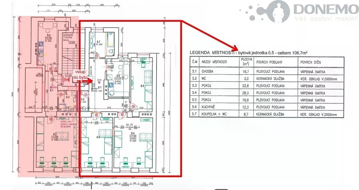 Nabízíme dlouhodobý pronájem cihlového bytu po kompletní rekonstrukci, který se nachází ve velmi oblíbené lokalitě na ulici Masarykova třída v Olomouci. Dispozice bytu je 3+1 (108,7 m2). Byt je umístěný ve 3 patře. Byt je po kompletní rekonstrukci, ( omítky, elektroinstalace, topná soustava včetně kotle, okna, podlahy, dveře, obklady, sanit atd.) Jedná se kvalitní stavbu, kde tloušťka mezibytových příček a příček v bytě zajišťuje dostatečný komfort. Podlahy jsou vinylové, okna dřevěné (euro okna). Byt se pronajímá včetně kuchyňské linky s vestavěnými spotřebiči čtyřzónová varná deska zn. Elektrolux, elektrická trouba zn. Elektrolux. V koupelně je prostorný sprchový kout, umyvadlo, otopný žebřík, přípojka na pračku. Wc závěsné. Internet optickým kabelem. Veškerá občanská vybavenost, centrum města, v blízkosti hlavního vlakového nádraží. Volný k nastěhování od 1.12.2025. nebo i od 1.11.2025. Cena 20 000 + zálohy na služby: studená voda 300 Kč 1 os., osvětlení společných prostor a úklid společných prostor 100 Kč, elektrická energie 1 100 Kč, plyn 300 Kč. Vratná jistota ve výši dvou nájmů. Odměna rk 1 nájem.