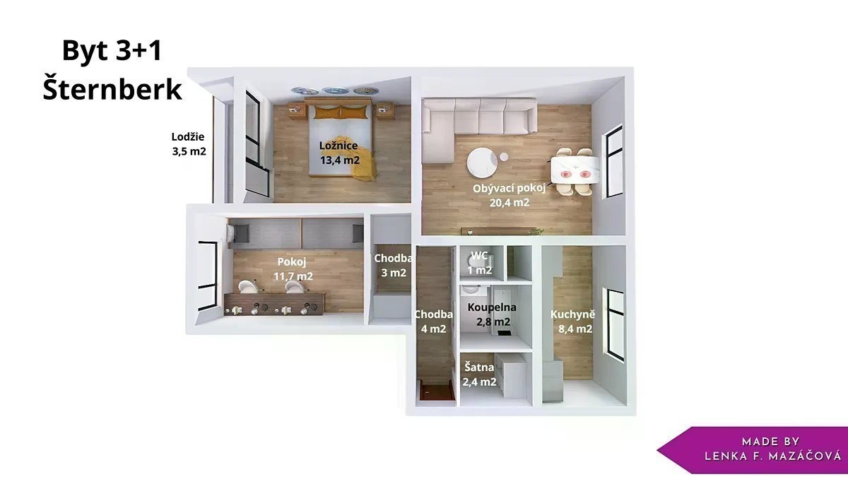 Pronájem prostorného bytu 3+1 s lodžií ve Šternberku. Hledáte opravdu velký byt, kde budete mít dostatek místa pro pohodlné bydlení celé rodiny? Pak vás jistě zaujme tato nabídka. V klidné části Šternberka, na Jiráskově ulici, nabízíme k pronájmu byt o dispozici 3+1 a výměře 75 m². Nachází se v 1. patře (2. nadzemní podlaží) panelového domu s výtahem, což oceníte nejen při stěhování, ale i při každodenním pohodlí. Základní informace o bytě: - dispozice bytu je 3+1 - celková plocha bytu 75 m2 - 1 patro, 2. NP - společná kolárna - byt je vyklizený a připravený pro nové nájemníky - lodžie o ploše 3,5 m2 - sklep o ploše 2 m2 Byt má tři samostatné pokoje, což zajišťuje dostatek soukromí pro všechny členy domácnosti. Z ložnice je vstup na prostornou lodžii, kde si můžete užít ranní kávu nebo odpočinek po práci. Obývací pokoj je propojený s kuchyní, což vytváří příjemný a praktický prostor pro rodinný život i setkávání s přáteli. Byt disponuje také lodžií o ploše 3,5 m², která je situovaná na východní stranu. Díky tomu si zde můžete užít příjemné ranní slunce a klidné posezení u kávy nebo snídaně. Při vstupu do bytu vás přivítá prostorná chodba, ze které se pohodlně dostanete do šatny, koupelny, na samostatné WC a do dalších pokojů. Byt se pronajímá nevybavený. Lokalita a občanská vybavenost Byt se nachází v oblíbené a praktické části města, kde máte vše na dosah: Obchody a služby - jen pár kroků od domu najdete Penny Market, kousek dál pak Lidl či menší obchůdky. V blízkosti je i pošta, bankomat, drogerie a další služby. Zdravotní péče - velkou výhodou je nemocnice Šternberk vzdálená jen několik minut pěší chůze. Školy a školky - v okolí se nachází mateřská i základní škola, takže pokud máte děti, bude to pro vás velké plus. Sport a volný čas - v pěším dosahu je sportovní areál, hřiště a nedaleko začínají i pěkné procházkové trasy do přírody. Dopravní dostupnost MHD a vlak - v blízkosti je zastávka MHD, která vás pohodlně dopraví po celém městě. Vlakové nádraží je jen několik minut jízdy, což oceníte při cestách do Olomouce. Automobil - autem se do centra Olomouce dostanete zhruba za 15-20 minut, napojení na hlavní silnici je rychlé a pohodlné. Měsíční nájemné je 11 000,- Kč/ měsíčně Inkaso činí 6.500, - Kč/ měsíčně (zálohy na elektriku, plyn, teplo, vodné a stočné a dále pak platbu za užívání a osvětlení společných prostor, výtah) Kauce činí jeden nájem. Provize RK je 13.000,-Kč Hledáte něco trochu jiného? Podívejte se na moji aktuální nabídku. A nebo přímo na stránkách Ostrovrealit