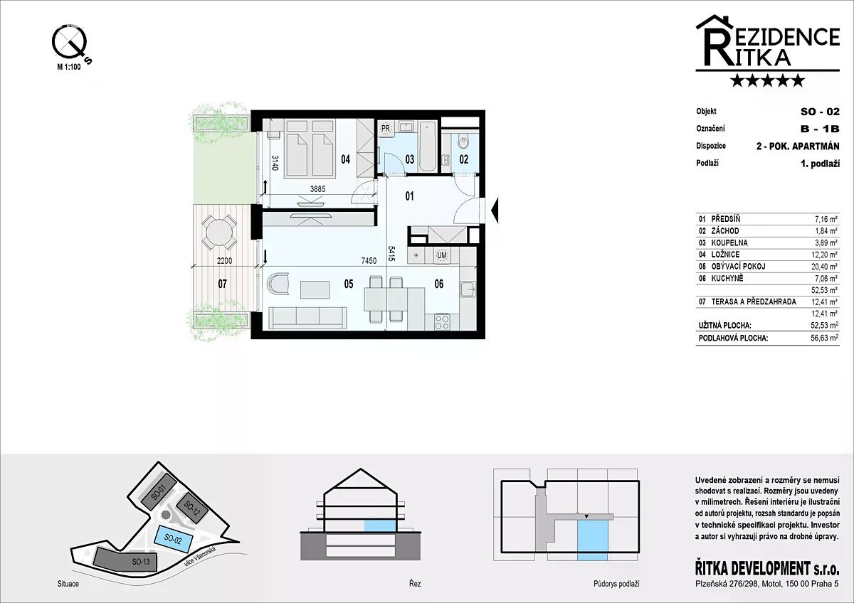 Nabízíme k prodeji moderní byt 2+kk v klidné části obce Řitka. Tento jednopodlažní byt je součástí novostavby skeletové konstrukce, jejíž výstavba započne v říjnu 2025 a bude dokončena koncem září 2027. Nabízí užitnou plochu 53 m² a podlahovou plochu 57 m², doplněnou o příjemnou terasu a lodžii. V ceně bytu je zahrnuta také sklepní kóje. Developer poskytuje možnost financovaní bytů klientům a to na začátku Rezervačním poplatkem nemovitosti ve výši 200.000,- bez DPH a následně při podpise SoBKS 20% z celkové ceny bytu, přičemž konečnou částku bude klient moct zaplatit až po kolaudaci celkové výstavby v roce 2027. Byt se nachází v prvním nadzemním podlaží třípodlažního domu s výtahem, což jej činí bezbariérově přístupným. Parkovací místo v společné podzemní garáži k bytu je potřeba přikoupit samostatně. Byt je vybaven moderními technologiemi, jako je například klimatizace a rekuperační systém, které zajišťují komfortní bydlení. Díky rozvodu na tří fázích je zajištěna efektivní distribuce elektrické energie. Sklepní kóje pro uskladnění vašich věcí zabezpečuje dostatek úložného prostoru a menší zahrada o ploše 13 m², kde si můžete vychutnat klid venkova, relax a čas strávený s rodinou. V případě potřeby elektromobilu je připravena nabíjecí stanice a bytové domy budou mýt moderní zabezpečení a ovládaní všech systému, které Vám zpříjemní bydlení. Energetická třída A zajišťuje, že tento byt je energeticky velmi efektivní, což určitě sníží náklady na bydlení. V standardním vybavení bytu je instalována tzv. Chytrá domácnost od společnosti LOXONE, aby jste byli v kontaktu s vaší nemovitostí kdekoli na světě budete. Dopravní dostupnost je vynikající autem, s možností využívat vlak, dálnici, silnici, MHD i autobus. Předpokládaný datum nastěhování je stanoven na konec prosince 2027. Tento byt je ideální volbou pro ty, kteří hledají harmonické bydlení v klidném prostředí s veškerým komfortem moderního domova pro svou rodinu. Pokud Vás tento byt zaujal, neváhejte nám napsat nebo zavolat a rádi Vám vše vysvětlíme osobně.