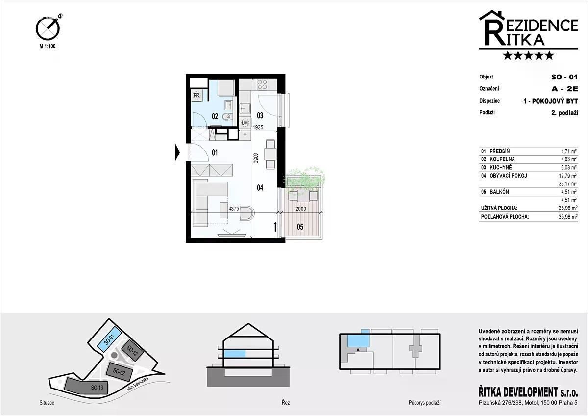 Nabízíme k prodeji moderní byt 1+kk v novostavbě s osobním vlastnictvím, nacházející se v klidné části obce Řitka. Tento jednopodlažní byt v druhém patře nabízí užitnou plochu o velikosti 36 m². Součástí je také balkon o ploše 5 m², který poskytuje příjemné místo pro relaxaci s výhledem na okolní přírodu. V ceně bytu je zahrnuta už sklepní kóje. Developer poskytuje financovaní bytů klientům a to na začátku Rezervačním poplatkem nemovitosti ve výši 200.000,- bez DPH a následně při podpise SoBKS 20% z celkové ceny bytu, přičemž konečnou částku bude klient moct zaplatit až po kolaudaci celkové výstavby v roce 2027. Byt je vybaven koupelnou se sprchovým koutem a systémem rekuperace, který zajišťuje efektivní výměnu vzduchu. Sklepní kóje o velikosti 5 m² bude další místo pro vaše věci, které se nevejdou do bytu. Budova je vybavena výtahem a je bezbariérová, což zajišťuje snadný přístup pro všechny obyvatele. V suterénu se nachází garážový dům, kde jsou vybudovány parkovací místa pro váš automobil. Automatická čtečka SPZ při vstupu do společné garáže ovládaná aplikaci od společnosti LOXONE včetně kamerového systému zabezpečí nejen komfort vstupu vozidel, ale také bezpečnost prostor, která je důležitou součástí bydlení. Díky výborné dopravní dostupnosti, a to jak vlakem, dálnicí, silnicí, MHD či autobusem, se jedná o ideální místo pro ty, kteří hledají klidné bydlení s rychlým spojením do okolních měst. Byt je součástí projektu, který bude zkolaudován v roce 2027. Energetická třída budovy je A, což zaručuje maximálně úsporný provoz a nízké náklady na bydlení. Pokud Vás tento byt zaujal, neváhejte nám napsat nebo zavolat a rádi Vám vše vysvětlíme osobně. Pro více informací o této nemovitosti nás prosím kontaktujte nebo vyplňte níže uvedený formulář, rádi Vám pomůžeme.