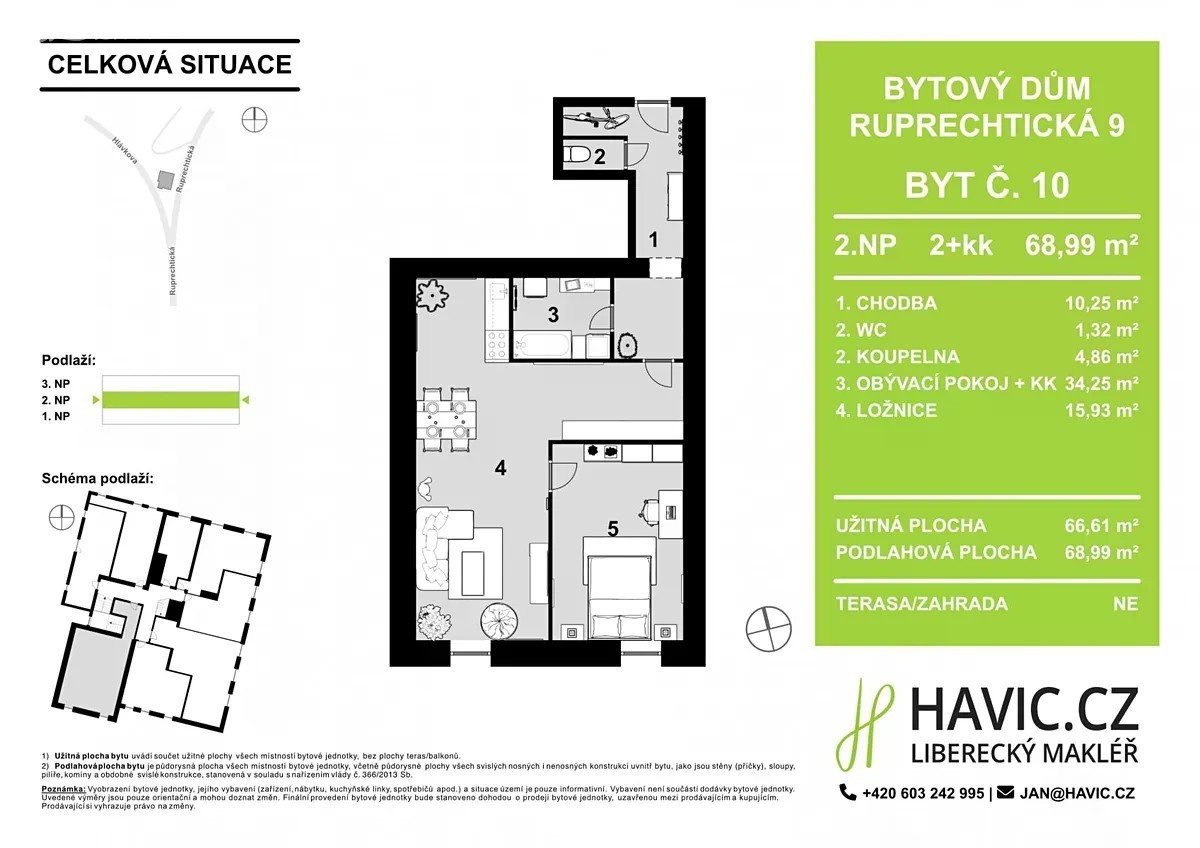 Bytový dům se nachází na adrese Ruprechtická 9/143 a v jeho okolí je kompletní občanská vybavenost. Samozřejmostí je ale i perfektní dostupnost do centra Liberce díky MHD, které má zastávky 150 metrů od domu. V okolí domu ale navíc naleznete obchod vzdálený 450 metrů a poštu, která se nachází vedle obchodu. Inzerovaná bytová jednotka má dispozici 2+kk a podlahovou plochu 68,99 metrů čtverečních. Dům prošel rekonstrukcí v roce 2020 a ta se skládala ze tří hlavních částí: - interiéry domu, kdy každý byt je ve vysokém standardu a jejich součástí je kuchyňská linka a sanitární technika. Rekonstrukcí prošly i společné prostory. V celém domě byly vyměněny rozvody elektřiny, vody i odpadů. - exteriér domu, kde byla provedena rekonstrukce fasády (dům nebyl zateplován) a byla vyměněna i veškerá okna za plastová. - okolí domu, čímž bylo možné zajistit u pěti bytových jednotek zahrádku a u jedné jednotky velkou střešní terasu. Díky terénním úpravám navíc vzniklo i 18 parkovacích stání. Dům je v dobrém technickém stavu, má 5 podlaží včetně 1 podzemního. Objekt je zabezpečen kamerovým systémem na dvou vnějších rozích budovy a ve vstupní chodbě se záznamovým zařízením. Do domu jsou navedené datové kabely pro internet od společnosti A-NET a televizi, které jsou rozvedeny i do jednotlivých bytů. Součástí každé bytové jednotky je vlastní elektro kotel, který se stará o vytápění bytu, a bojler starající se o ohřev teplé užitkové vody. Náklady bytové jednotky: - Osvětlení společných prostor: 30,- Kč - Správa: 190,- Kč - Pojištění: 43,- Kč - Dlouhodobé zálohy na opravy: 25,- Kč/m2 - Správní činnost 100,- Kč/jednotka - Anténa: 10,- Kč - Studená voda: 450,- Kč/osoba Součástí bytu je parkovací stání přidělené v rámci prohlášení vlastníka přímo k bytu. Váš Liberecký makléř Jan Havič