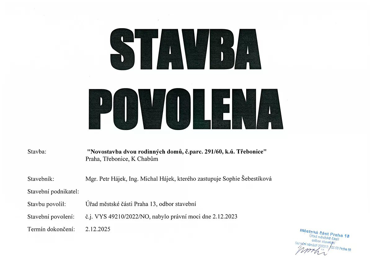 Nabízíme výstavbu architektonicky výjimečného řadového rodinného domu (jedná se o polovinu dvojdomu) na vlastním samostatném pozemku, s vlastním číslem popisným, samostatným vjezdem a přístupem k domu, privátním parkovacím stáním a samostatnými přípojkami elektro a vody. Pečlivě vyprojektovaný a velkorysý dům je umístěn na nádherném, slunném, jižně orientovaném pozemku o výměře 489 m2, s volným výhledem do krajiny, vzdáleném pouhých 800 m od Metropole Zličín! Stavební povolení je v právní moci, výstavba může být zahájena prakticky okamžitě, dokončení projektu na konci roku 2026. Výstavbu zajistí osvědčená developerská společnost, majiteli pozemku se stáváte ještě před samotným započetím výstavby! Novostavba domu má dispozici 4+kk a disponuje podlahovou plochou 117 m2 ve třech podlažích, včetně suterénu, obestavěný prostor je cca 670 m3. Z inženýrských sítí je k dispozici elektřina a vodovod z městského řadu, odkanalizování bude řešeno pomocí domácí čistírny odpadních vod. Vytápění teplovodním podlahovým topením poháněným tepelným čerpadlem vzduch voda, umístěným na střeše objektu. Velmi kvalitní zděná stavba postavená ve vyšším standardu, smluvní dodavatelé - SIKO Zličín (koupelny + WC), Decointeriér Chráštany (podlahové krytiny a interiérové dveře). Energetická třída (PENB) „A“ - mimořádně úsporná! Uvedená cena je za dokončený rodinný dům včetně pozemku o výměře 489 m2 a DPH ve výši 12 % (dům). Developer nabízí hypoteční financování klientům u partnerské banky a také prodej stávajících nemovitostí klientů (bytů, domů) prostřednictvím svého realitního makléře.