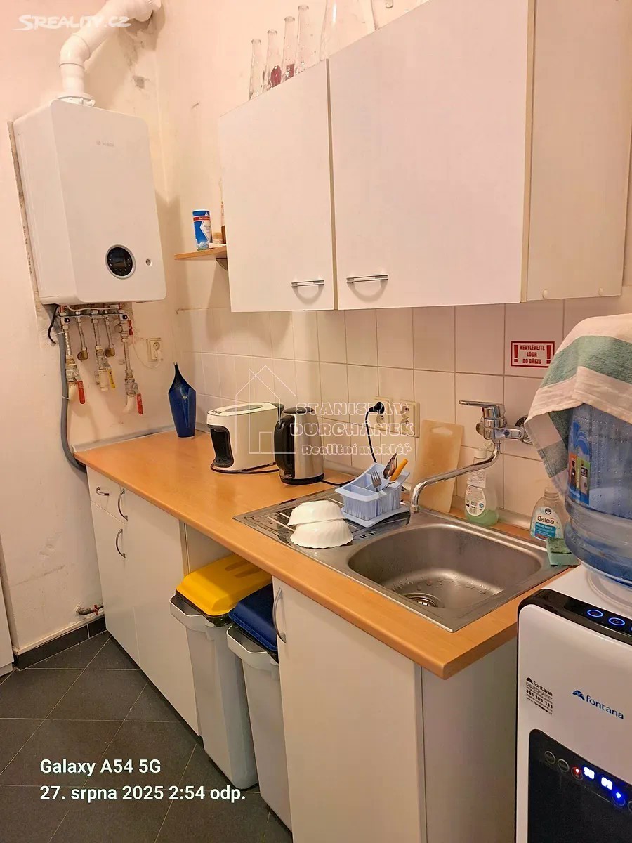 Nabízíme k dlouhodobému pronájmu světlé kancelářské prostory o velikosti 103 m² ve zvýšeném přízemí administrativní budovy, pouhé 3 minuty chůze od stanice metra a autobusového nádraží Florence. Prostory jsou rozděleny do 5 místností, dále je zde kuchyňka, samostatné WC a chodba. Na oknech jsou žaluzie a vytápění zajišťuje nový kondenzační plynový kotel. Kanceláře jsou napojeny na optickou síť - vysokorychlostní internet, vhodný i pro náročné firemní využití. K dispozici od 1. 12. 2025 (prohlídky možné ihned). Před předáním bude nově vymalováno a položeny nové koberce.