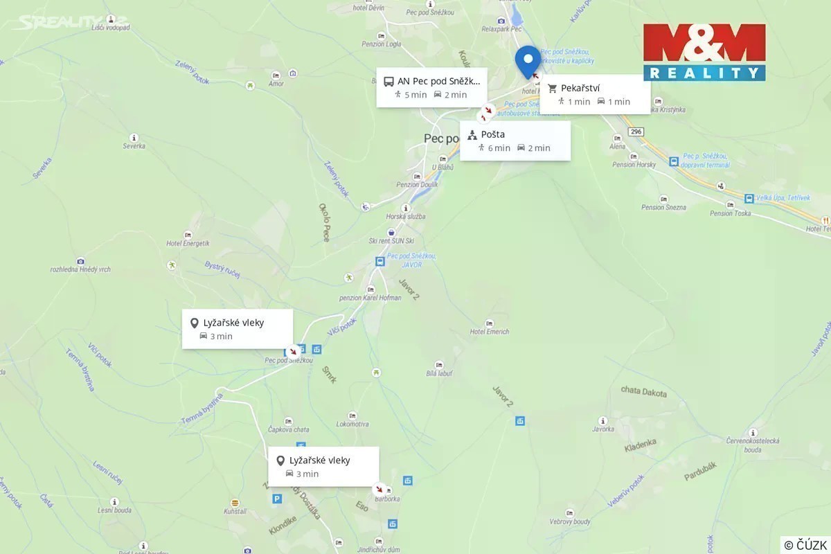 Nabízíme k prodeji byt 2+kk o užitné ploše 55 m² s garážovým stáním, který se nachází v samém centru Pece pod Sněžkou a je v osobním vlastnictví. Byt je umístěn ve 2. podlaží čtyřpodlažního cihlového domu z roku 2001, jehož dispozici tvoří obývací pokoj s kuchyňským koutem, ložnice a koupelna. K bytu náleží dva balkony o celkové ploše 8 m² s krásným výhledem a sklep o velikosti 2 m². Vytápění i ohřev vody zajišťuje plynový kotel, dům je napojen na plynovod, vodovod i kanalizaci a samozřejmostí je elektřina 230 V, internetové připojení a kabelová televize. Kuchyňská linka je vybavena spotřebiči, které zůstávají součástí prodeje. Ve městě je kompletní občanská vybavenost a zároveň výborná dostupnost k lyžařským střediskům i turistickým trasám. Byt je ideální jak pro trvalé bydlení, tak pro milovníky hor a představuje atraktivní investiční příležitost s možností krátkodobého pronájmu. Rádi Vám pomůžeme s vhodným financováním. Pro prohlídku neváhejte kontaktovat makléře!