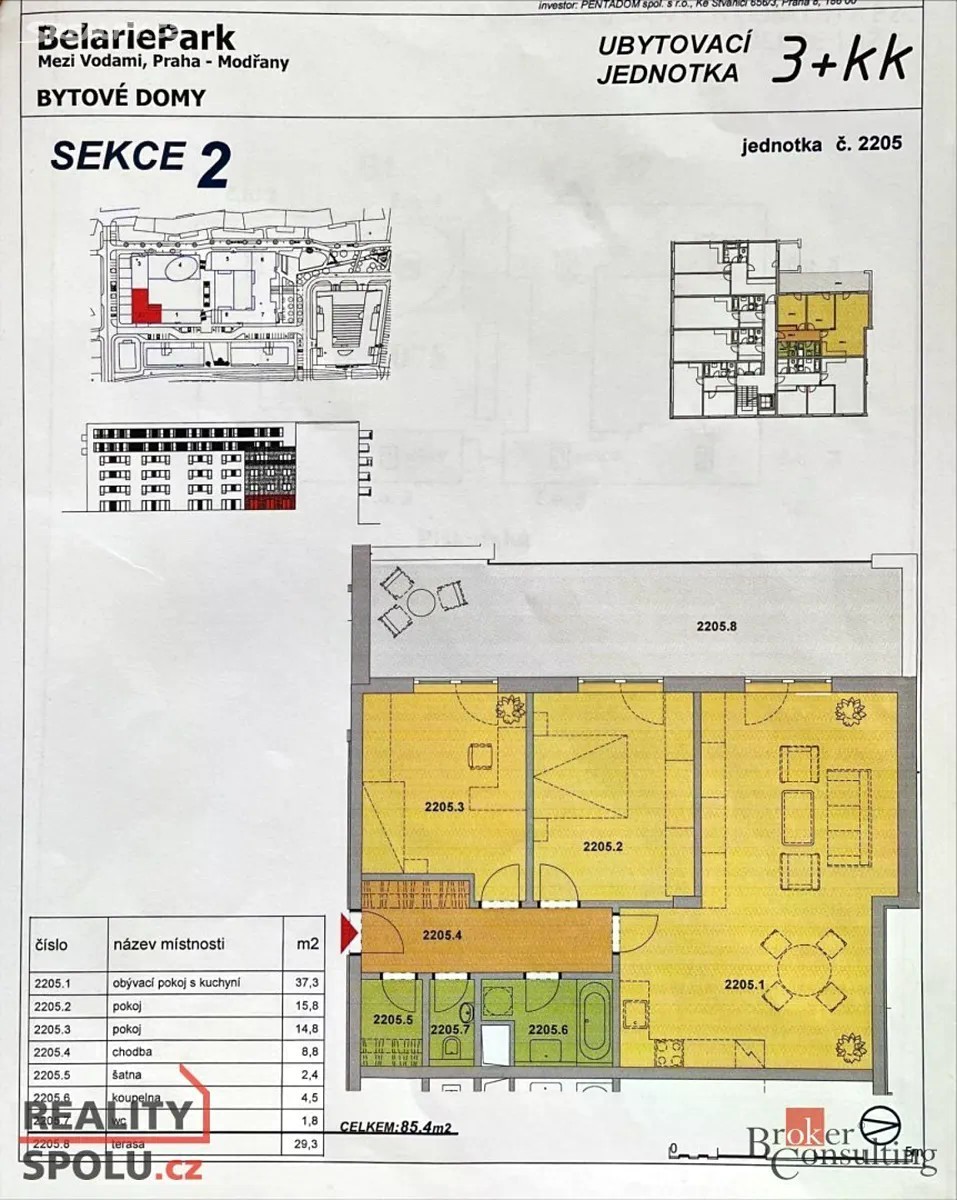 K dlouhodobému pronájmu nabízíme ubytovací jednotku 3+kk o ploše 87,5 m². V katastru nemovitostí je vedena jako „jiný nebytový prostor“, avšak dle kupní smlouvy a dokumentace je specifikována jako ubytovací jednotka a dlouhodobě užívaná jako byt. Jednotka díky svému dispozičnímu řešení a vybavení poskytuje veškerý komfort moderního bydlení. Budova má energetickou náročnost PENB C. Dominantou jednotky je prostorný obývací pokoj s kuchyňským koutem a terasou, které tvoří přirozené centrum domova. Dvě samostatné ložnice zajistí dostatek soukromí a pohodlí. Samozřejmostí v dispozici bytu je také koupelna s vanou, samostatné WC, šatna a praktická chodba. K jednotce patří velkorysá terasa pro odpočinek a rodinná setkání. Další výhodou je komora na stejném patře a garážové stání přímo v domě, které výrazně zvyšují komfort bydlení. Dům se nachází v klidné rezidenční části Modřan v ulici Pískařská (projekt BelariePark Modřany), ideální pro aktivní život i odpočinek. Okolí nabízí cyklostezku A2 podél Vltavy, Freestyle park, sportovní areál Hamr a golfové hřiště Hodkovičky. Nedaleká přírodně chráněná oblast Modřanská rokle láká k procházkám a pěším výletům v přírodě. Veškerá občanská vybavenost je pohodlně dostupná - obchody, restaurace, školy i školky. Tramvajová zastávka Belárie zajišťuje rychlé spojení do centra Prahy, takže lokalita spojuje klidné prostředí s komfortem městského života. Perfektní místo pro ty, kteří hledají kombinaci klidu, přírody a moderního bydlení v Praze. Poplatky jsou kalkulovány pro čtyřčlennou rodinu ve výši 6.300 Kč (4.600 Kč služby bytového domu + 1.700 Kč zálohy na energie které budou převedeny na nájemce). Byt je vhodný pro rodiny s dětmi, nekuřáky. Vratná kauce = 2x měsíční nájemné. Provize = 1x nájem plus DPH 21%. Jednotka je k dispozici od 1.11.2025 a je ideální pro nájemníky, kteří hledají prostorné, kvalitní a dlouhodobé bydlení v atraktivní lokalitě Prahy 12.