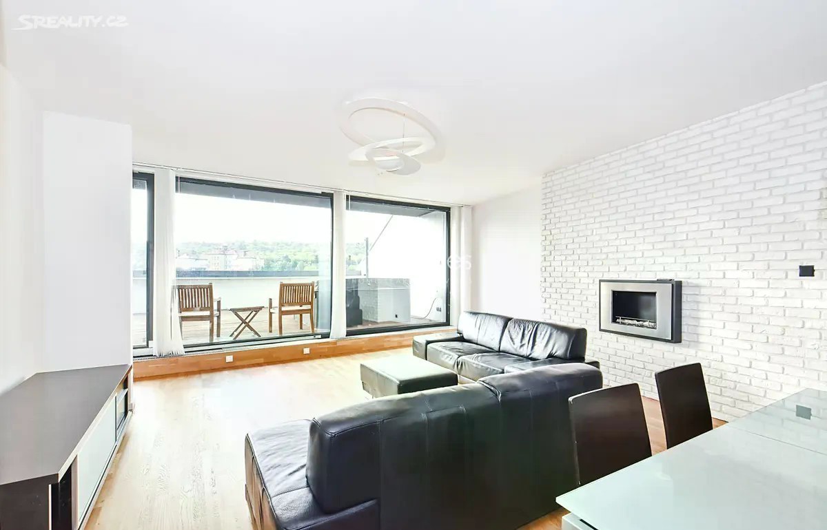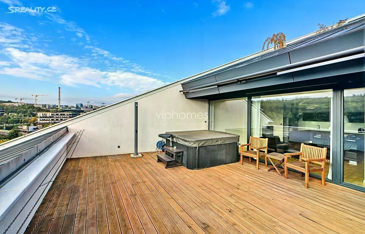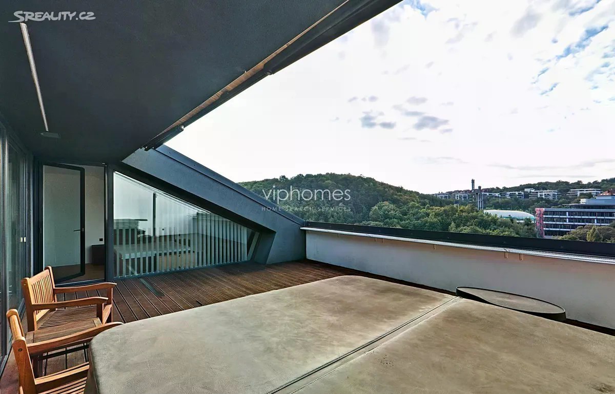 Nabízíme k pronájmu prostorově nadstandardní byt 4+kk, o rozloze 139m2, který se nachází v unikátním rezidenčním projektu z roku 2015. Tato architektonicky výjimečná budova je umístěná v zeleni, ve svahu mezi Malvazinkami a Radlickou ulicí. Rezidenci tvoří dva nezávislé rezidenční bloky propojené elegantní kovovou lávkou s parkem. Oba objekty vytvářejí v jejich centru dvoranu, která je přístupná majitelům i uživatelům bytů. Designové bydlení v kombinaci s perfektní dostupností a občanskou vybaveností. Samotný byt poskytuje ojedinělé bydlení s neobyčejnou dispozicí. Elegantní oddělení zóny obytné a relaxační zajišťuje uživatelům klid a zároveň plné využití obytného prostoru, včetně venkovní terasy v době denní aktivity. Hlavní obytný prostor je spojen s kuchyní, jídelním koutem; velké dveřní okno se vstupem na terasu poskytuje dostatek slunečního svitu. V zimních měsících je zde i domácí lihový krb. Kuchyňská linka je vybavena elektrickými spotřebiči moderního typu. K dispozici jsou 3 samostatné ložnice, 2 designové koupelny - jedna s vanou i sprchovým koutem, druhá se sprchovým koutem. Dále je zde velká prostorná chodba s dostatečným úložným prostorem, místností na pračku a sušičku a WC pro hosty. Hlavní ložnice se vstupem na terasu, šatnou a prostornou koupelnou s WC je orientována na jihozápad. K bytu náleží intimní 45m2 terasa s nádherným výhledem do okolí, orientovaná na jihovýchod. Sklep o velikosti 5 m2 se nachází v 2.patře nikoliv v suterénu domu. Dvě parkovací stání. Ve všech prostorách domu jsou bezpečnostní kamery. Zálohy na elektrickou energii jsou 2.940 KČ. Rezidenční budova je zasazena do zeleně, výhled je naprosto úžasný a prostor okolo domu je velkoryse otevřený. Lávkou v zadní části objektu se dostanete do parku, kde je možné se projít či zasportovat. Před domem je zastávka tramvaje, metro Radlická je 5 minut od domu a dostupnost do centra města je snadná a rychlá. Doporučujeme osobní prohlídku. Pro více informací nás neváhejte kontaktovat. Volné ihned.