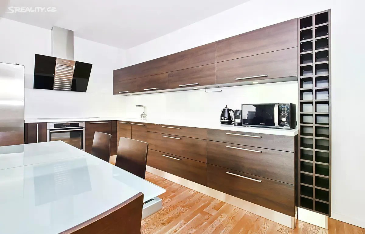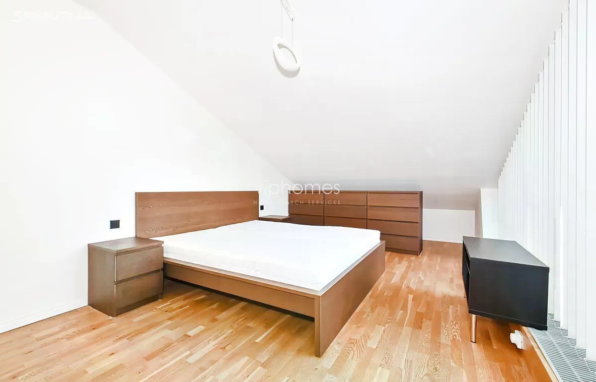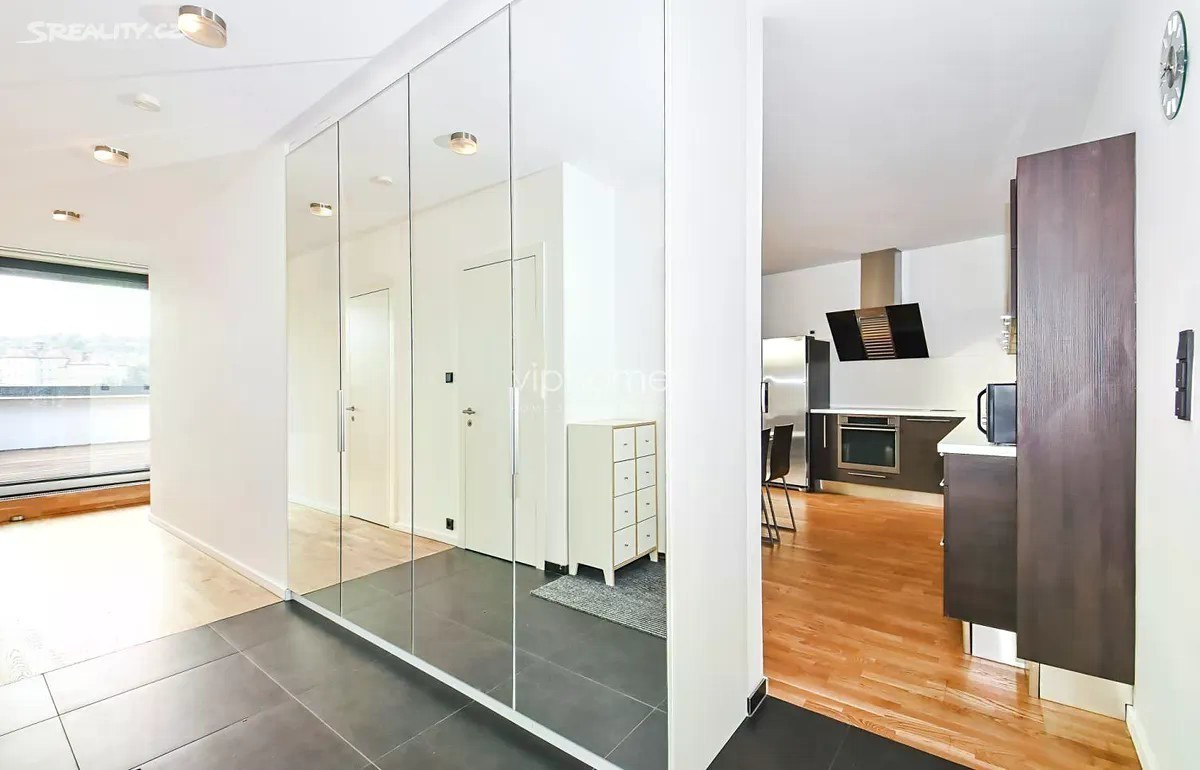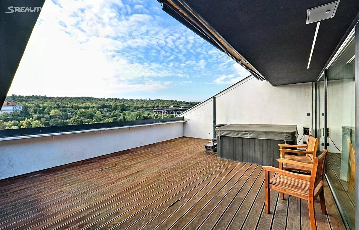 Nabízíme k pronájmu prostorově nadstandardní byt 4+kk, o rozloze 139m2, který se nachází v unikátním rezidenčním projektu z roku 2015. Tato architektonicky výjimečná budova je umístěná v zeleni, ve svahu mezi Malvazinkami a Radlickou ulicí. Rezidenci tvoří dva nezávislé rezidenční bloky propojené elegantní kovovou lávkou s parkem. Oba objekty vytvářejí v jejich centru dvoranu, která je přístupná majitelům i uživatelům bytů. Designové bydlení v kombinaci s perfektní dostupností a občanskou vybaveností. Samotný byt poskytuje ojedinělé bydlení s neobyčejnou dispozicí. Elegantní oddělení zóny obytné a relaxační zajišťuje uživatelům klid a zároveň plné využití obytného prostoru, včetně venkovní terasy v době denní aktivity. Hlavní obytný prostor je spojen s kuchyní, jídelním koutem; velké dveřní okno se vstupem na terasu poskytuje dostatek slunečního svitu. V zimních měsících je zde i domácí lihový krb. Kuchyňská linka je vybavena elektrickými spotřebiči moderního typu. K dispozici jsou 3 samostatné ložnice, 2 designové koupelny - jedna s vanou i sprchovým koutem, druhá se sprchovým koutem. Dále je zde velká prostorná chodba s dostatečným úložným prostorem, místností na pračku a sušičku a WC pro hosty. Hlavní ložnice se vstupem na terasu, šatnou a prostornou koupelnou s WC je orientována na jihozápad. K bytu náleží intimní 45m2 terasa s nádherným výhledem do okolí, orientovaná na jihovýchod. Sklep o velikosti 5 m2 se nachází v 2.patře nikoliv v suterénu domu. Dvě parkovací stání. Ve všech prostorách domu jsou bezpečnostní kamery. Zálohy na elektrickou energii jsou 2.940 KČ. Rezidenční budova je zasazena do zeleně, výhled je naprosto úžasný a prostor okolo domu je velkoryse otevřený. Lávkou v zadní části objektu se dostanete do parku, kde je možné se projít či zasportovat. Před domem je zastávka tramvaje, metro Radlická je 5 minut od domu a dostupnost do centra města je snadná a rychlá. Doporučujeme osobní prohlídku. Pro více informací nás neváhejte kontaktovat. Volné ihned.