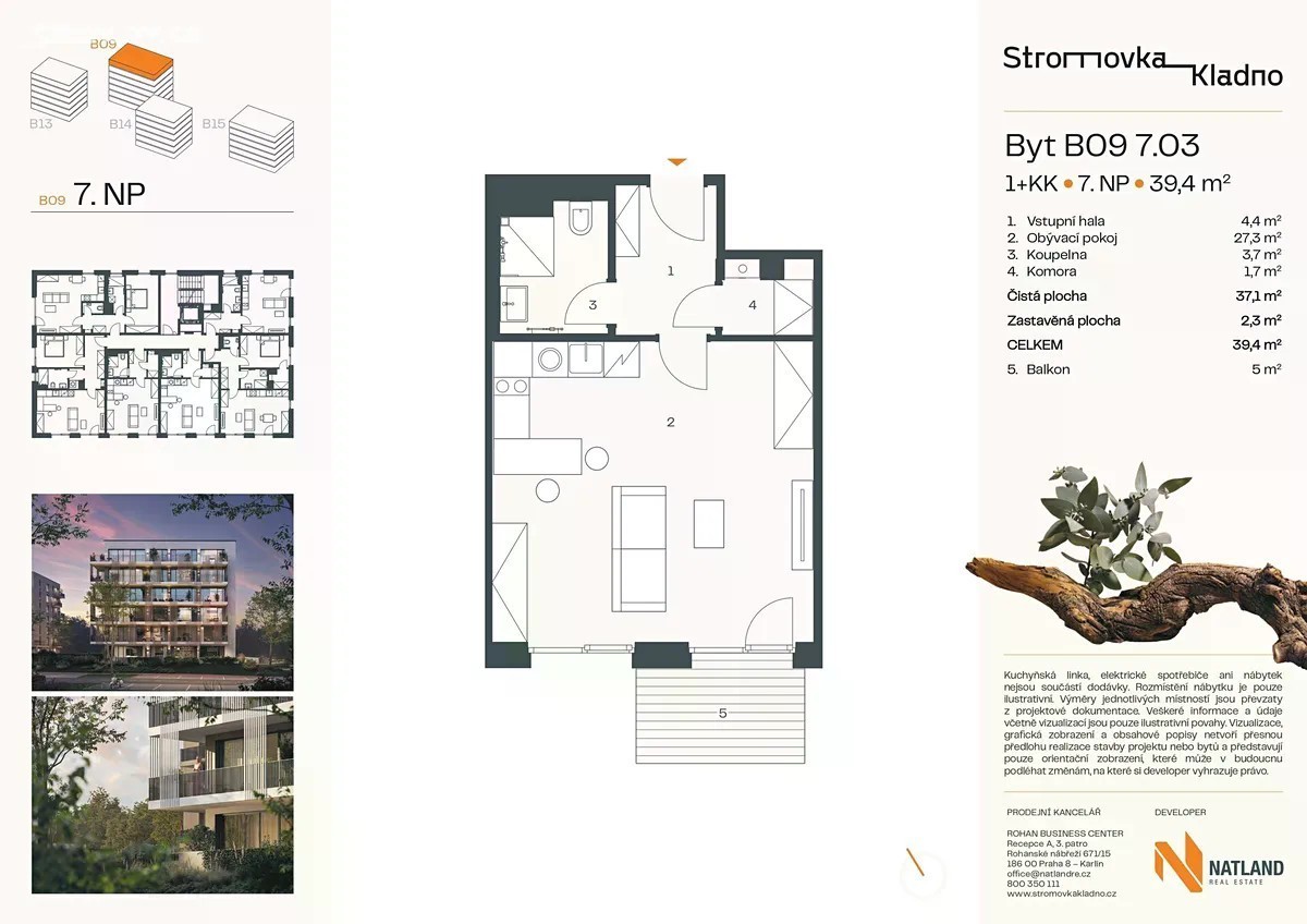 Byt 1+kk s balkonem, orientovaný na jih. Koupelna se sprchovým koutem. Příprava na pračku v komoře.