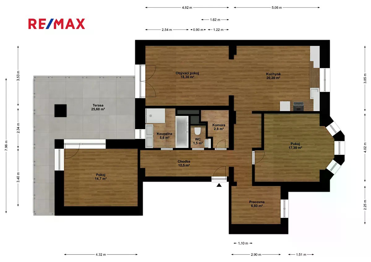 Nově rekonstruovaný byt s dispozicí 4+kk o výměře cca 100 m2 a nadstandardní terasou cca 26 m2 se nachází v 1. patře nově rekonstruovaného domu v Plzni na Slovanské ulici. Byt čeká na svého prvního nájemce. Okna dvou pokojů a kuchyňského koutu jsou orientována na západní stranu, okna obývacího pokoje a ložnice s terasou na východní stranu do zahrady se vzrostlými stromy, kterou nájemce může využívat k relaxaci. Kuchyňský kout je s moderní kuchyňskou linkou s indukční varnou deskou, multifunkční troubou, mikrovlnnou troubou a myčkou nádobí. V koupelně je sprchový kout i vana, toaleta je zvlášť. Úložné prostory nabízí komora. Byt vytápí radiátory, v domě je centrální plynový kotel, měřiče tepla, vody i elektřiny má každý byt v domě vlastní. Internetové připojení zajišťuje společnost CETIN. Parkovat osobní automobil lze dle domluvy s majitelem na dvoře za domem. Nyní probíhají úpravy terénu dvora, budou instalována nová vjezdová vrata ( na fotografii jsou vrata původní). Měsíční záloha na energie a služby včetně elektřiny činí 5.000 Kč, kauce je 30.000 Kč a provize RK je 29.000 Kč + 21 % DPH. V okolí domu je veškerá občanská vybavenost a pěší dostupnost MHD.