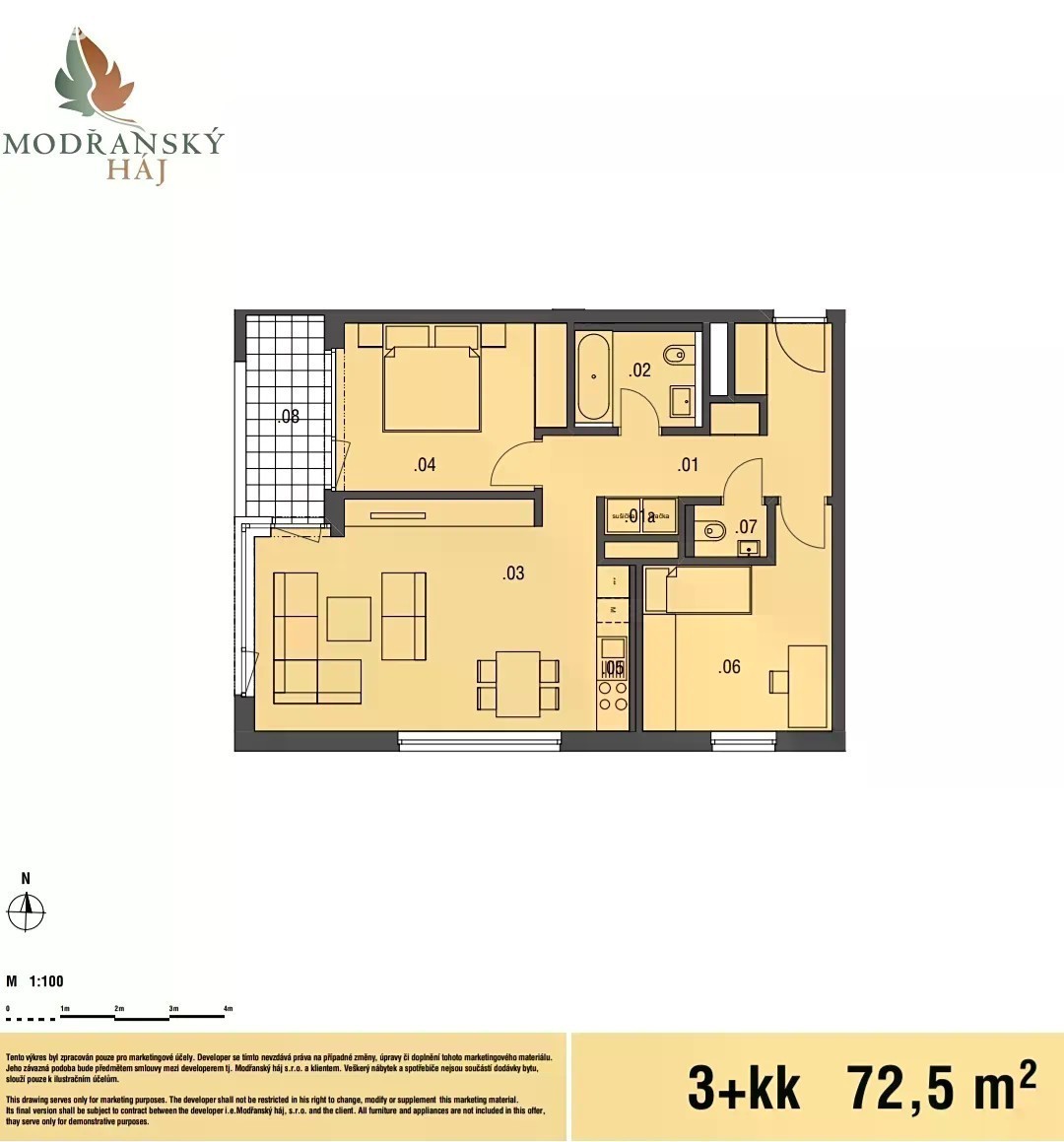Prodej moderního bytu 3+kk, 71,8 m² + balkon 5,5 m² - Praha 12, Komořany Byt je součástí rezidenčního projektu Modřanský háj, kolaudovaného v roce 2020. Dispozice: 3+kk Užitná podlahová plocha dle Prohlášení vlastníka: 71,8 m² Sklep: 7,7 m² Balkon: 5,5 m² Podlaží: 1. NP Stáří domu: 5 let Popis bytu Nabízíme k prodeji moderní a světlý byt 3+kk o užitné podlahové ploše 71,8 m² s balkonem 5,5 m², sklepem 7,7 m² a možností koupě garážového stání v podzemí domu. Byt má 2x WC a jedno WC je součástí hl.koupelny. Součástí ceny je vybavení na míru v hodnotě 350.000 Kč - kuchyňská linka se spotřebiči (myčka, lednice, trouba, mikrovlnná trouba, varná deska, digestoř, pračka a sušička) a 3x vestavěné skříně s velkým úložným prostorem. Dispozice: prostorný obývací pokoj s kuchyňským koutem a vstupem na balkon, ložnice, dětský pokoj / pracovna, koupelna s vanou, samostatné WC, technická místnost s pračkou a sušičkou. Cenová politika Cena bytu vč. balkonu a vybavení: 11.990.000 Kč Celková cena vč. sklepa a garážového stání: 12.790.000 Kč Sleva 50.000 Kč při sjednání hypotéky přes našeho poradce - sazba 4,19%-4,29%max. Sleva 200.000 Kč při rychlém jednání - podpis rezervační smlouvy do konce října Výhody byt v klidné části Prahy 12 - Modřany, v blízkosti přírody (Modřanská rokle cca 350m, Modřanská cyklo/inline stezka 3min.od bytu) i MHD (zastavka MHD primo pred domem) balkon orientovaný do vnitrobloku se zelení orientace na zapad, podzemní garážové stání a sklep přímo v domě.Male nakupni centrum s Billou 350m od domu, do centra 30min a na Budejovickou 10-15min.