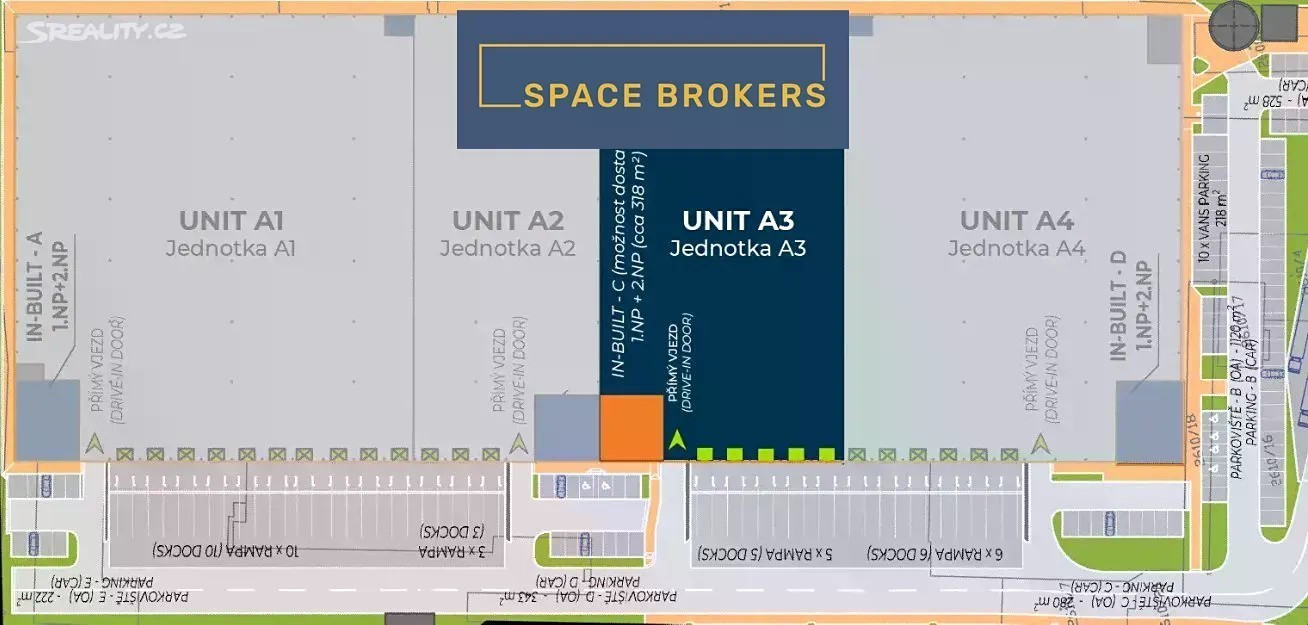 Nabízíme bez provize nové moderní skladové, nebo výrobní prostory k pronájmu v novém průmyslovém parku Logicor Průmyslová. Velikost jednotek: - celkem 10.295 m2 volných skladových prostor s možností dělení na dvě jednotky Hala A3 - 4.760 m2 Hala A4 - 5.535 m2 - kancelářské a sociální zázemí na míru dle požadavků klienta Časování projektu: - k dispozici ihned Technická specifikace: - přístup do hal pomocí docků a přímých vjezdů - světlá výška 12 m - nosnost podlah 5 t/m2, bezprašná - manipulační a parkovací plochy - LED osvětlení Rádi poskytneme více informací na vyžádání. Kontaktujte nás pro sjednání prohlídky. Neplatíte provizi. Pomůžeme Vám při jednáních o nájemních podmínkách i nájemní smlouvě.