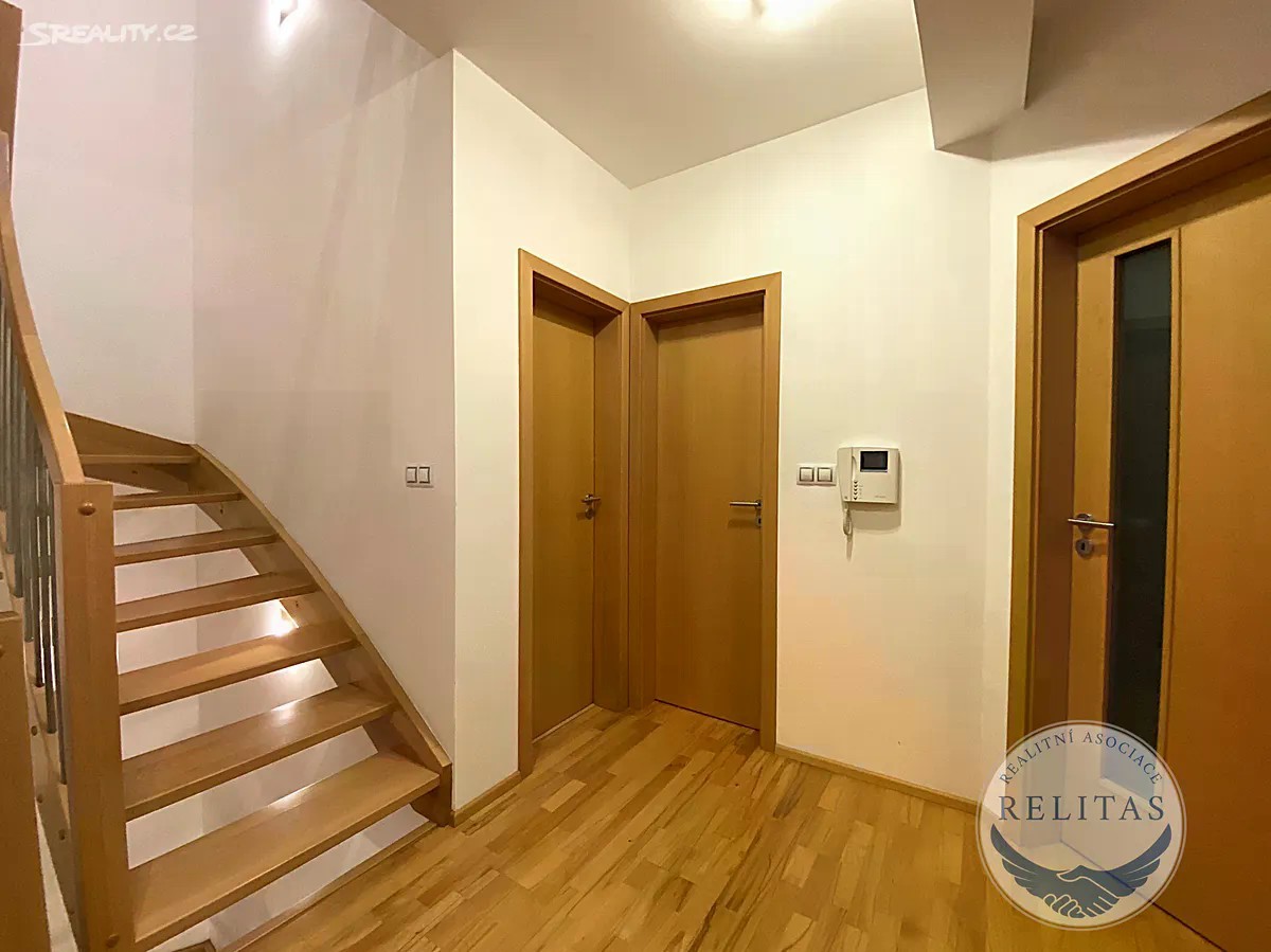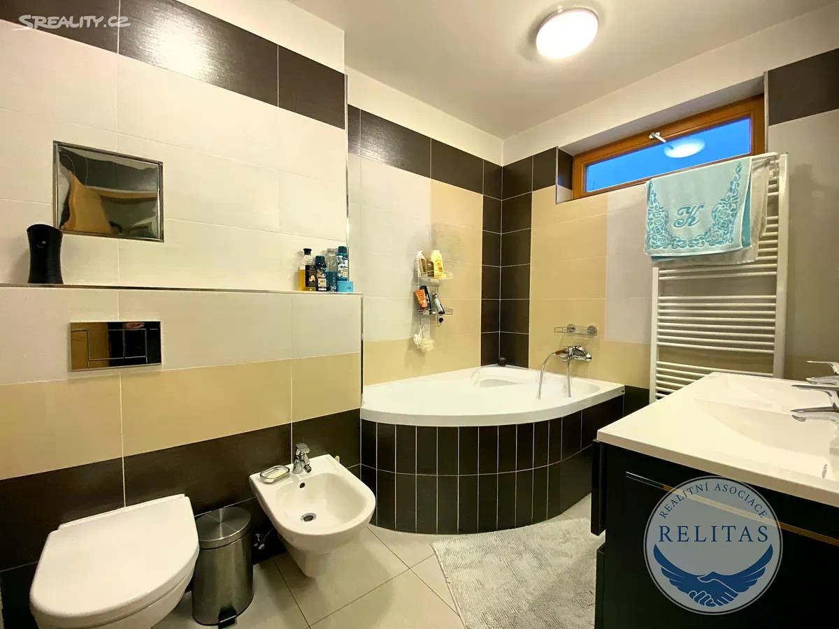 Nabízíme k prodeji třípodlažní rodinný dům v pražské části Slivenec s užitnou plochou cca 180 m2, dvěma terasami, garáží a menší zahradou (55 m2, pozemek celkem 178 m2). Dům je koncipován pro bydlení větší rodiny, sestává z obývacího pokoje v přízemí o velkosti 37 m2 s kuchyňským koutem s linkou s indukční varnou deskou, myčkou, větší lednicí s mrazákem a digestoří, přízemí doplňuje předsíň, WC a garáž s přímým vstupem do domu. Po schodišti jsou přístupné tři ložnice v prvním poschodí, šatna a prostorná koupelna se dvěma umyvadly a vanou. Ve druhém patře je umístěna největší ložnice s terasou, další pokoj s druhou terasou, koupelna se dvěma umyvadly a sprchovým koutem a technickou místností. Kromě garáže jsou k dispozici další 2 parkovací stání před vchodem. Dům z roku 2014 je postaven jako skeletový s cihlovým dozděním, je osazen dřevěnými okny, doplněnými roletami s automatickým systémem, které zajištují příjemné klima ve všech ročních obdobích, podlahy jsou položeny dřevěné s dlažbou v provozních místnostech, dveře dřevěné. Vytápěn je vlastním plynovým kotlem, možno v budoucnu nahradit tepelným čerpadlem. Do všech místností jsou zavedeny kabelové rozvody, instalován je domácí telefon s displejem. Umístění domu na konci slepé ulice zajišťuje absolutní klid, menší zahrada v zadní částí, přístupná z obývacího pokoje, pak dostatečné soukromí. Lokalita Slivence na západním okraji Prahy nabízí bydlení v klidné rezidenční zóně, přitom dobrou dostupnost - autem na D5, resp. Pražský okruh nebo autobusem MHD. Kromě základních nákupních a stravovacích možnosti v místě je možno využít vše potřebné na blízkém sídlišti Barrandov, které nabízí nejen množství obchodů, ale také základní, mateřskou a uměleckou školu, polikliniku nebo aquacentrum. Dům bude uvolněn po dohodě cca v polovině roku 2025.