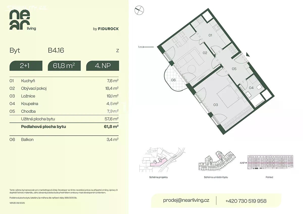 Nabízíme k prodeji byt 2+1 o podlahové ploše 61,8 m² s balkonem 3,4 m² v developerském projektu NEAR living v Praze 8, vznikajícím na pomezí Palmovky a Karlína. V rychle se rozvíjející pražské čtvrti Palmovka, jen pár minut od metra, roste nová rezidence, která splní představy o moderním městském bydlení. Nabízí kombinaci klidného zázemí, stylového interiéru a snadné dostupnosti centra. Díky poloze budete mít na dosah Karlín, Holešovice i Rohanský ostrov - a domov, kam se budete s radostí vracet. V projektu vznikne celkem 212 nízkoenergetických bytů s vlastní komunitní zahradou 425 m². Každý z bytů, od startovacího 1+kk po rodinné 3+kk, byl navržen s důrazem na efektivní využití prostoru a kvalitní vybavení. Propojuje architekturu s praktičností, město s klidem a život s budoucností. Stane se tak budoucí architektonickou ikonou Palmovky, která je dílem prestižního architektonického studia IBA architects. Součástí standardu je podlahové vytápění i rekuperace - pro maximální pohodlí a příjemnou atmosféru domova. Vinylové podlahy, designové obklady a keramická dlažba na výběr z několika dekorů. Plastová okna s izolačním trojsklem, příprava na venkovní žaluzie na všech oknech uliční fasády. Rezidence energetické třídy B bude mít celkem 8 nadzemních podlaží a dvě podzemní. K bytům je možnost dokoupení garážového stání a sklepů. Bydlet na pomezí Palmovky a Karlína dnes znamená víc než jen dostupnost metra. Znamená to být blízko ke všemu, co dělá město městem - dobrá káva, kultura, parky i klidné místo pro sebe. Máte rádi pulzující centrum Prahy nebo Karlín, Žižkov či Holešovice? Všude zvládnete dojít za pár minut - pěšky, na kole, tramvají nebo metrem, které se nachází jen 6 minut od projektu (stanice Palmovka a Invalidovna). Díky poloze, moderním standardům a nízkým provozním nákladům je projekt atraktivní jak pro vlastní bydlení, tak pro investici. Developerem projektu je společnost Fidurock - česká nemovitostní investiční skupina. Dokončení projektu je plánováno na 4Q 2027.