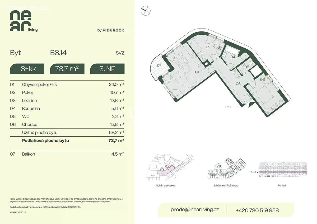 Nabízíme k prodeji byt 3+kk o podlahové ploše 75,7 m² s balkonem 5,9 m² v developerském projektu NEAR living v Praze 8, vznikajícím na pomezí Palmovky a Karlína. V rychle se rozvíjející pražské čtvrti Palmovka, jen pár minut od metra, roste nová rezidence, která splní představy o moderním městském bydlení. Nabízí kombinaci klidného zázemí, stylového interiéru a snadné dostupnosti centra. Díky poloze budete mít na dosah Karlín, Holešovice i Rohanský ostrov - a domov, kam se budete s radostí vracet. V projektu vznikne celkem 212 nízkoenergetických bytů s vlastní komunitní zahradou 425 m². Každý z bytů, od startovacího 1+kk po rodinné 3+kk, byl navržen s důrazem na efektivní využití prostoru a kvalitní vybavení. Propojuje architekturu s praktičností, město s klidem a život s budoucností. Stane se tak budoucí architektonickou ikonou Palmovky, která je dílem prestižního architektonického studia IBA architects. Součástí standardu je podlahové vytápění i rekuperace - pro maximální pohodlí a příjemnou atmosféru domova. Vinylové podlahy, designové obklady a keramická dlažba na výběr z několika dekorů. Plastová okna s izolačním trojsklem, příprava na venkovní žaluzie na všech oknech uliční fasády. Rezidence energetické třídy B bude mít celkem 8 nadzemních podlaží a dvě podzemní. K bytům je možnost dokoupení garážového stání a sklepů. Bydlet na pomezí Palmovky a Karlína dnes znamená víc než jen dostupnost metra. Znamená to být blízko ke všemu, co dělá město městem - dobrá káva, kultura, parky i klidné místo pro sebe. Máte rádi pulzující centrum Prahy nebo Karlín, Žižkov či Holešovice? Všude zvládnete dojít za pár minut - pěšky, na kole, tramvají nebo metrem, které se nachází jen 6 minut od projektu (stanice Palmovka a Invalidovna). Díky poloze, moderním standardům a nízkým provozním nákladům je projekt atraktivní jak pro vlastní bydlení, tak pro investici. Developerem projektu je společnost Fidurock - česká nemovitostní investiční skupina. Dokončení projektu je plánováno na 4Q 2027.