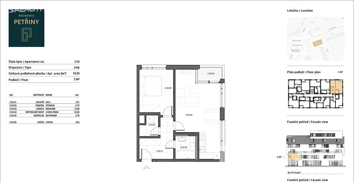 Projekt obsahuje 26 prémiových bytů v osobním vlastnictví v těsné blízkosti metra Petřiny a Obory Hvězda. Byty mají podlahové vytápění, dřevěné podlahy, klimatizaci, chytrou domácnost, venkovní žaluzie či je na výběr z luxusních materiálů. Bytový dům má dispozice bytů od menších 1+kk po příjemných 4+kk. Každý byt je jiný a něčím specifický. Ať už je to výhled, dispozice či velkorysá terasa. Dispozice bytu 2+kk s označením 2.04. Byt se nachází ve 2.NP s výtahem. Disp.: zádveří 7,97 m2, komora 2,70 m2, ložnice 12,08 m2, obytný prostor 24,38 m2, koupelna 3,78 m2. Lodžie 2,56 m2. Celková plocha: 55,30 m2. Orientace bytu je SZ,V. V ceně je 1 parkovací stání a 1 kóje. Lokalita: Město: Už několik let jsou pražské Petřiny vyhledávanou městskou čtvrtí. Je to dáno, polohou, klidem i vybaveností. Jedním z nejpodstatnějších benefitů je dopravní dostupnost. Stanice metra trasy A Petřiny umožňuje rychlé přesuny napříč celé metropole. Autem pár minut na letiště, nákupní centrum Zličín, pražský okruh nebo Smíchovskou náplavku nebo na kole za sportem do blízkého parku Ladronka. Petřiny jsou dnes moderní část Prahy spojující v sobě klid, pohodu a životní styl. Příroda: Rezidence Petřiny má přírodu doslova na dosah. Stačí pět minut procházkovým tempem a jste v oboře letohrádku Hvězda. Inline bruslení, jogging nebo volleyball naleznete v nedalekém parku Ladronka a nejhezčí scenérie máte na dosah v chráněné oblasti Divoká Šárka s vodní nádraží Džbán. Pro více informací mě kontaktujte.