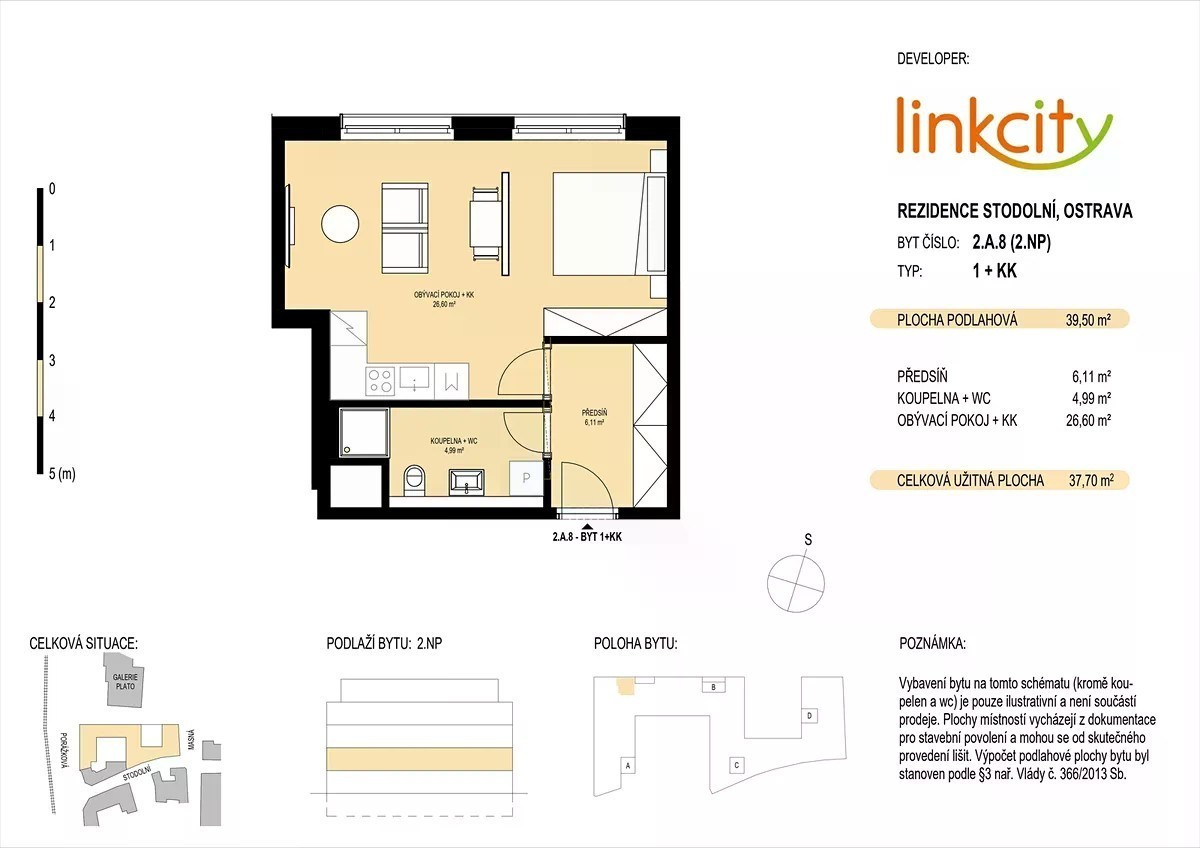 Novinka v projektu Rezidence Stodolní - z velkých bytů jsme udělali malé a vzniklo tak 14 nových bytů 1+kk - 2+kk. Tento je jeden z nich: Nová bytová jednotka 3.B.9 - dispozice 1+kk s 39,5 m2 podlahové plochy - umístěn ve 2. NP projektu s orientací na Galerii Plato - jedná se o přímý nákup bytu od developera (exkluzivní zastoupení) Rezidence Stodolní je nejmodernější bytový projekt v Ostravě z dílny Bogle Architects. Inspirován Londýnem, stvořen pro Ostravu. Moderní rezidenční dům se 131 byty, dvěma komunitními zahradami, byty s vlastní předzahrádkou i velkou terasou. Kromě moderních bytů projekt nabídne skvělá technická řešení - fotovoltaiku na střeše, díky které bude provoz bytu až o 40% levnější. Podzemní garáž se 120 parkovacími místy, plně připravena na elektromobilitu - většinu parkovacích míst dokážeme pokrýt nabíjecími stanicemi. V současné době již byla zahájena výstavba projektu, dokončení s předáním bytů je plánováno na konec roku 2027. Více informací o projektu a nabídku všech volných bytů najdete na webové stránce projektu, případně vše s vámi rád proberu telefonicky nebo při osobní schůzce.