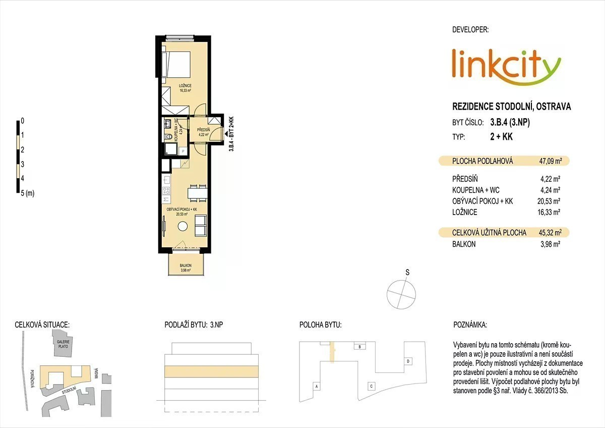 Novinka v projektu Rezidence Stodolní - z velkých bytů jsme udělali malé a vzniklo tak 14 nových bytů 1+kk - 2+kk. Tento je jeden z nich: Nová bytová jednotka 3.B.4 - dispozice 2+kk se 47 m2 podlahové plochy - balkón s výměrou 3,98 m2 - umístěn ve 3. NP projektu s orientací na dvě světové strany (Galerie Plato + vnitřní zahrada) - jedná se o přímý nákup bytu od developera (exkluzivní zastoupení) Rezidence Stodolní je nejmodernější bytový projekt v Ostravě z dílny Bogle Architects. Inspirován Londýnem, stvořen pro Ostravu. Moderní rezidenční dům se 131 byty, dvěma komunitními zahradami, byty s vlastní předzahrádkou i velkou terasou. Kromě moderních bytů projekt nabídne skvělá technická řešení - fotovoltaiku na střeše, díky které bude provoz bytu až o 40% levnější. Podzemní garáž se 120 parkovacími místy, plně připravena na elektromobilitu - většinu parkovacích míst dokážeme pokrýt nabíjecími stanicemi. V současné době již byla zahájena výstavba projektu, dokončení s předáním bytů je plánováno na konec roku 2027. Více informací o projektu a nabídku všech volných bytů najdete na webové stránce projektu, případně vše s vámi rád proberu telefonicky nebo při osobní schůzce.