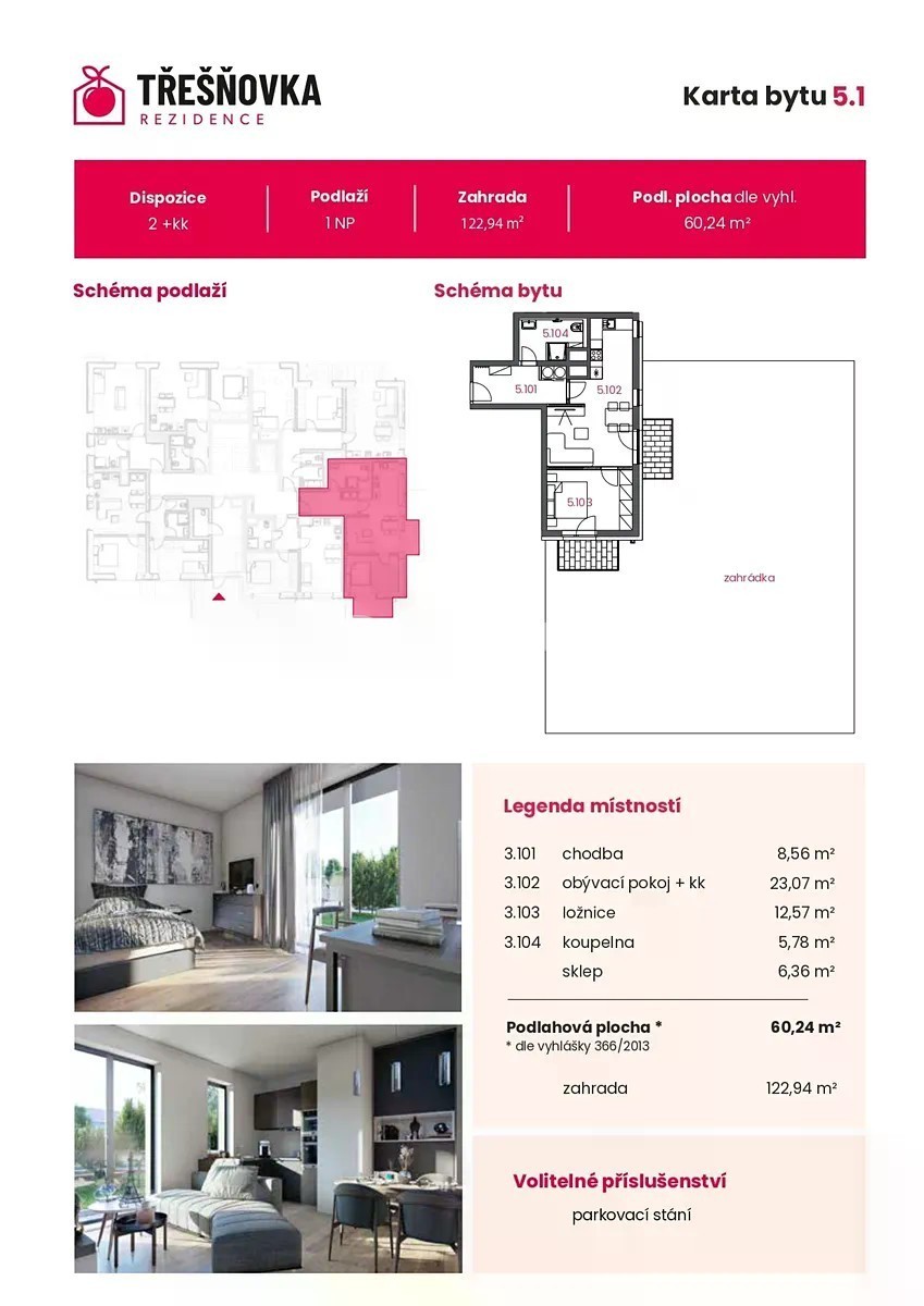 Máme tu pro vás jedinečnou příležitost zažít pohodlný život ve vysoce kvalitním bytě v novém developerském projektu Rezidence Třešňovka. Tento moderní bytový dům s názvem Rezidence Třešňovka bude dominantou uzavřeného rezidenčního areálu na okraji prestižní vilové čtvrti města Kolín ve středočeském kraji s bezprostřední blízkostí občanské vybavenosti. Výjimečný životní styl Uzavřený rezidenční areál s parkovištěm a parkovou úpravou. Elektronabíječky pro auta přímo v areálu. Lavičky a slunečníky pro relaxaci v příjemném prostředí. Dětské hřiště pro radost nejmenších obyvatel. Moderní bydlení 4 patra a jedno podzemní podlaží s nebytovými prostory a sklepními kójemi. Kamerový systém pro maximální bezpečnost. Příprava na předokenní žaluzie. Zateplení pro úsporu energií. Plastová okna s trojskly pro optimální izolaci. Elektronický vjezd a 2 vstupní branky pro omezený přístup. Orientace bytů Primárně východní a západní orientace pro optimální osvětlení. Nabízená jednotka Bytová jednotka 2+kk o podlahové ploše 60,24 m² (dle vyhl. 366/2013 Sb.) se zahradou (122,94 m²), která se nachází ve 1. NP a je členěná na vstupní chodbu (8,56 m²), obývací pokoj + kk (23,07 m²), ložnici (12,57 m²) koupelnu (5,78 m²) a sklep. Vybavení bytů Balkony, terasy nebo předzahrádky ke každému bytu. Kvalitní podlahy a velkoformátové obklady. Moderní sanitární technika Příprava na kuchyňskou linku ve spolupráci se společností ORESI Pohodlí a parkování Možnost dokoupit parkovací stání přímo v areálu. Nenechte si ujít příležitost stát se součástí prestižního projektu Rezidence Třešňovka a zažít nový standard bydlení v Kolíně. Pro více informací a schůzku nás neváhejte kontaktovat. Vaše nové bydlení na vás čeká. Stavební povolení již bylo vydáno, dokončení je tak plánované na 4Q 2025. Více informací naleznete na webu rezidencetresnovka. Financování zajistí naši hypotéční specialisté. Pravidelně budeme pořádat dny otevřených dveří, které budou blíže specifikovány na webových stránkách projektu. Těšíme se na viděnou. Za Rezidenci Třešňovka Martin Kročko