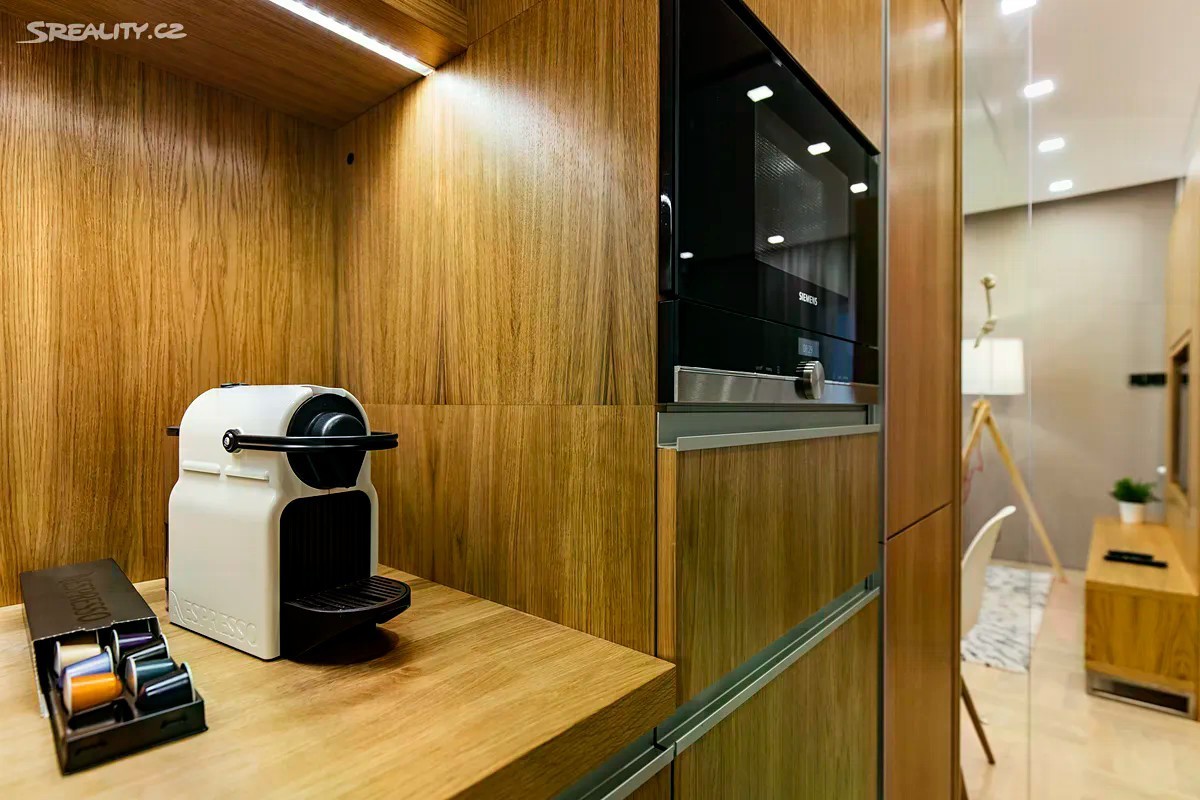 Ve výhradním zastoupení nabízíme vybavený ateliér 1kk od renomovaného architektonického Studia by Donlić v rezidenci SPALENA5 oceněné Realitní projekt roku 2016. Byt se nachází v zeleném vnitrobloku residence a je velmi tichý. Mezi hlavní vybavení tohoto patří klimatizační jednotka Mitsubishi, eurookna s trojskly, jež jsou stíněny dálkově ovládanými blackout roletami, parkety z běleného dubu skládané do čtverců, kompletní interiér z dubu, skla a nerezu, kuchyňské spotřebiče Miele - varná deska, lednice s mrazákem, trouba, kombinovaná pračka se sušičkou. V obývací části je na otočném panelu umístěna smart TV s Netflix, audio přehrávač Sony. Byt je zcela zařízený včetně nádobí, kávovaru atd. Rezidence Spalená5 má recepci v režimu 24/7. Díky velikosti je byt vhodný pouze pro 1 osobu. Měsíční záloha na energie a služby včetně recepce a internetu: 6.858 Kč + el. energie přepsána na nájemce. Jistota (kauce) ve výši 56.000 Kč Odměna za zprostředkování ve výši jednoho měsíčního nájmu plus DPH.