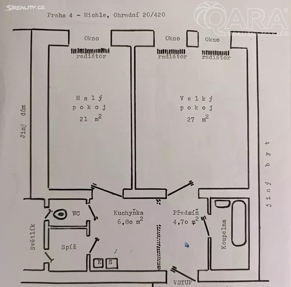 Exkluzivně nabízíme k prodeji byt v osobním vlastnictví o dispozici 2 + 1, situovaný ve 4. nadzemním podlaží šestipodlažního cihlového domu s výtahem. Tento prostorný byt s celkovou plochou 65 m² se nachází na adrese Ohradní 420/20, v příjemné a vyhledávané lokalitě Praha 4 - Michle. Nemovitost je v původním stavu, což poskytuje novému majiteli možnost kompletní rekonstrukce podle vlastních představ. Byt disponuje základními inženýrskými sítěmi, včetně přívodu vody z místního vodovodu, elektrického připojení, plynovodu a odvodu odpadních vod do kanalizace. Topení je zajištěno plynovým kotlem a teplá voda je dodávána plynovou karmou. Dům byl postaven před rokem 1930, nabízí klidnou atmosféru v okolí. Privatizace byla dokončena v roce 2010 a objekt prošel v letech 2013 a 2014 rozsáhlými rekonstrukcemi. V roce 2011 byla vyměněna okna a stoupačky. Výtah, fasáda, střecha cca. v roce 2015. Okna bytu jsou orientována do ulice Ohradní na severozápad, což zajišťuje dostatek světla. K bytu patří také nově zbudovaná sklepní kóje o rozloze 4 m² umístěná v suterénu domu. Parkování je možné před domem. V okolí nemovitosti se nachází veškerá občanská vybavenost, včetně základních a mateřských škol, zdravotního střediska, lékárny, obchodů a supermarketů, banky, pošty, restaurací a široké nabídky sportovního vyžití. Dopravní dostupnost je výborná, autobusové zastávky Ohradní a Hadovitá se nachází v pěší vzdálenosti. Dále je třeba zmínit, že společenství vlastníků jednotek velmi dobře hospodaří a nemá žádné úvěry. Celkové měsíční náklady na bydlení činí pouhých 3 300 Kč, + elektřina a plyn. V případě zájmu o prohlídku nás neváhejte kontaktovat.