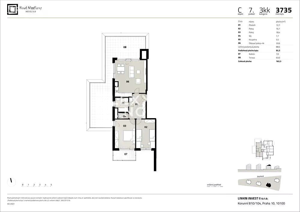 Nové Modřany vám nabízí k prodeji velkorysý byt 3+kk s balkónem. Byt se nachází v 6. patře moderní rezidence, která vyrůstá v pražských Modřanech. Projekt zkolaudován, byty jsou ihned k předání. Nové Modřany jsou unikátní projekt, který v sobě spojuje komfort velkoměsta a svobodu přírody. Nadstandardní byt 3+kk o velikosti 93,2 m² vás okouzlí balkónem, který developer zvětšil, aby byt propojil s okolní zelení. Součástí projektu Nové Modřany je venkovní posilovna, kavárna, 3 dětská hřiště s trampolínami a na východní straně vyrůstá park. V projektu také najdete kočárkárnu, stojany na koloběžky a elektrické nabíječky na auta. Modřany patří mezi pražské čtvrti, kde je živo. Stačí seběhnout k Vltavě, sednout na kolo nebo se projít v Modřanské rokli. Na nákupy i zmrzlinu budete chodit pěšky a všechno, co potřebujete, si zařídíte v Modřanech. Tramvaj z Modřan vás bez přestupu doveze do centra za pár minut a přímé napojení na pražský okruh vás plynule propojí s D1 i ostatními dálnicemi.