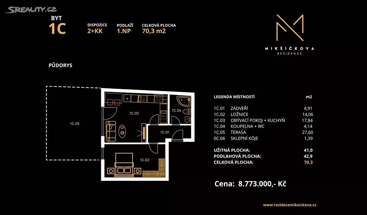 Vítejte v Rezidenci Mikšíčkova, kde nabízíme k prodeji exkluzivní byt o dispozici 2+kk, který je situovaný v jedné z nejatraktivnějších lokalit v Brně a to konkrétně v Mikšíčkově ulici v městské části Židenice. Tento moderní byt o celkové ploše 70,3 m² se nachází v 1. nadzemním podlaží čtyřpodlažního bytového domu, který představuje ideální kombinaci komfortu a elegance. Tato novostavba byla pečlivě navržena s ohledem na vysoké požadavky moderního bydlení. Byt je vybavený současnými prvky, které zajišťují maximální pohodlí a funkčnost. S užitnou plochou 41 m² nabízí ideální prostor pro relaxaci a každodenní život, při zachování stylového a útulného prostředí. Tuto skutečnost podtrhuje dále také fakt, že v rámci bytového domu se nachází pouze 13 jednotek. Nemovitost je prodávána již včetně veškerého vybavení jako je kuchyňská linka s vestavěnými spotřebiči a také nábytek přímo na míru daným dispozicím, jehož design představuje dokonalou kombinaci ergonomie a originality. Vše je navrženo a zpracováno studiem kuchyně a nábytek ARVAY, které se vyznačuje jedinečným designem a perfektním zpracováním do posledního detailu. Hlavní předností této nemovitosti je její jedinečné umístění. Židenice se pyšní klidnou atmosférou, avšak zároveň je zde výborná dostupnost do centra města a dalších okolních lokalit. V okolí naleznete všechny potřebné služby, jako jsou obchody, restaurace a kulturní vyžití, což činí tuto lokalitu mimořádně atraktivní pro náročné klienty. Interiér bytu je důmyslně řešen tak, aby bylo maximizováno využití prostoru. Moderní design a kvalitní materiály podtrhují luxusní charakter této nemovitosti. Větraný a prosvětlený prostor je ideální pro pohodu a relaxaci, zatímco velká okna zajišťují dostatek denního světla. Celkový dojem z bytu je umocněn výbornou dopravní dostupností a širokým spektrem možností pro aktivní trávení volného času. Tento byt je nejen skvělou investicí, ale také místem, kde se spojí komfort, styl a výhody městského života. K nemovitosti je navíc možnost zakoupení garážové stání, jenž se nachází v 1. PP bytového domu. Předpokládaný termín nastěhování je: IQ/2027 Pokud Vás naše nabídka zaujala, neváhejte nás kontaktovat pro bližší informace nebo se můžeme rovnou domluvit na osobním setkání.