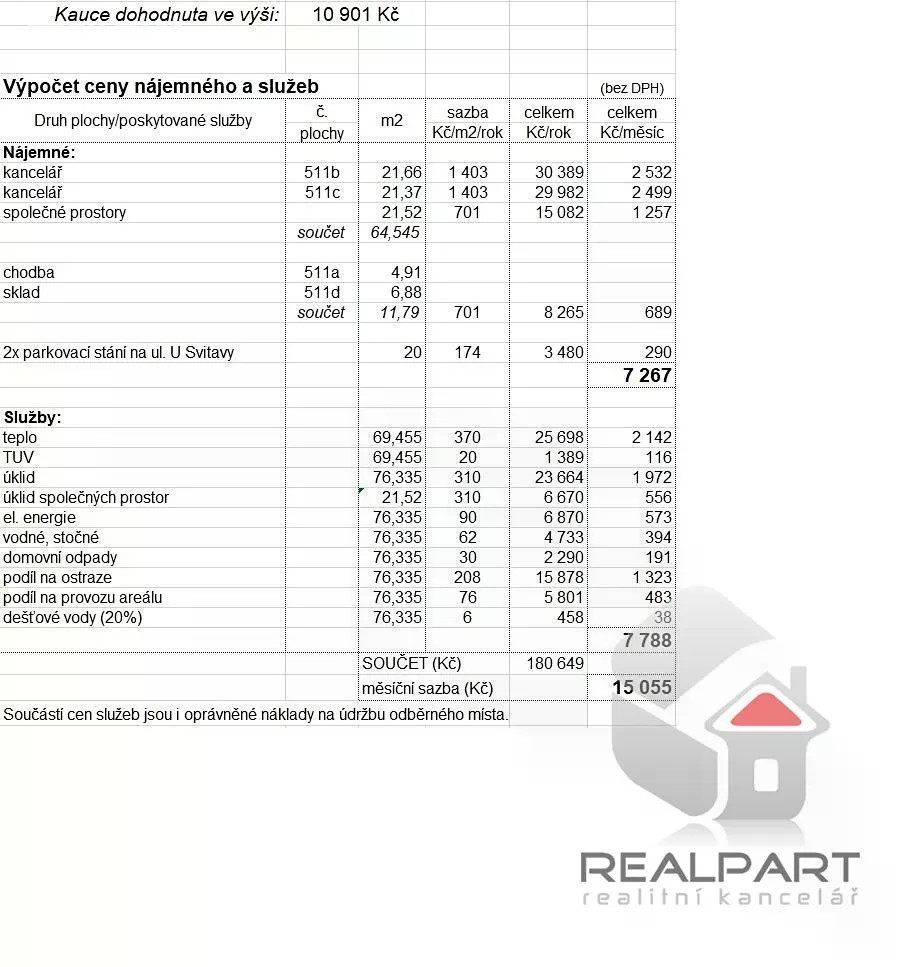 Nabízíme k pronájmu kancelář (2 místnosti + recepce + sklad) o celkové výměře 54,82 m2, obec Brno - Černovice, ul. U Svitavy. Kancelář se nachází v 6.NP / 6.NP administrativní budovy s výtahem. V kanceláři je položený nový zátěžový koberec. Areál je hlídán ostrahou 24h denně, k dispozici kantýna, recepce, služby ostatních firem v areálu. Možnost zapojení internetu a telefonu - není zahrnuto ve službách. Umístění sídla společnosti je možné. Na patře se nachází společná kuchyňka, k dispozici společná sprcha. V ceně je zahrnuto 2 parkovací stání u areálu, možnost pronájmu i více aut. Ihned k dispozici, pro více informací nás kontaktujte.