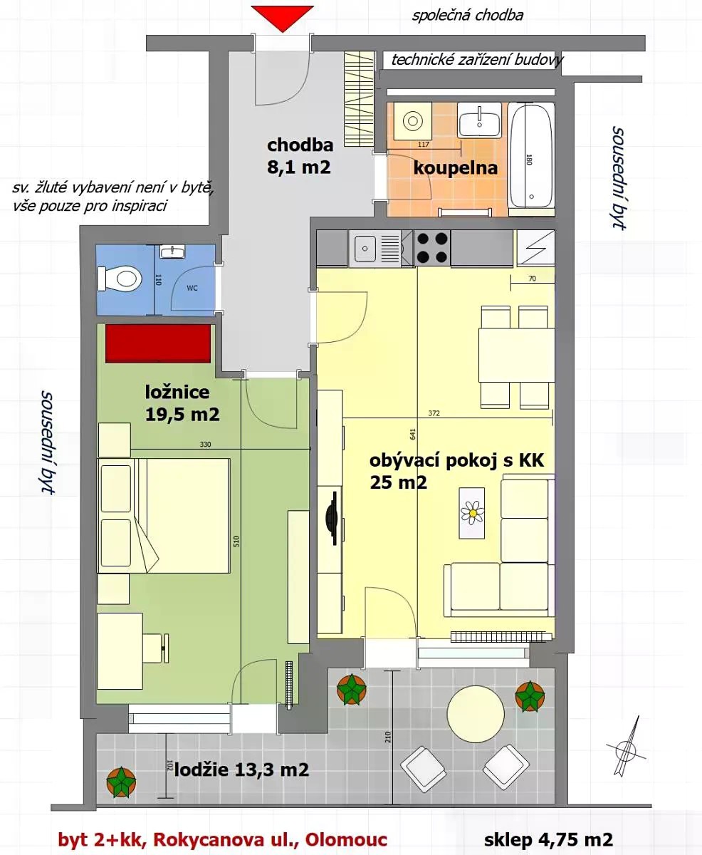 Prostorný nezařízený byt 2+kk ve 3. NP o velikosti 67,7 m2 vč. zděného sklepu 4,75 m2 + velká lodžie na jih 13,3 m2, celkem 81 m2, v cihlovém bytovém domě, ul. Rokycanova, blízko nákupní galerie Šantovka, blízko centra Olomouce. Dům byl dokončen v r. 2017, k pronájmu bude připravený od 16.11.2025, bude nová bílá výmalba. Dispozici a vybavení bytu uvidíte na půdorysu - z chodby vejdeme do 2 neprůchozích pokojů, koupelna s vanou a WC s umývadlem zvlášť, v ložnici je dost místa i na pracovní stůl nebo žehlení, cvičení. V bytě aktuálně bydlí mladý pár se psem. Na foto uvidíte jejich další vybavení i fotky od předchozích nájemců z r. 2022. Byt nebude zařízený nábytkem, pouze kuch. linka bez ledničky a 1 skříň v ložnici, tak je to vyznačeno i na půdorysu. V bytě zůstane dále garnyž v pokoji, žaluzie a osvětlení, vše ostatní si vybaví nájemce podle sebe. Okna trojskla plastová se žaluziemi, podlahy světlý vinyl, v koupelně a WC dlažba, na lodžii stínící dřevěné posuvné žaluzie zajišťující tepelnou pohodu, v obývacím pokoji rekuperační jednotka pro stálý přívod čerstvého vzduchu. Ve všech místnostech instalováno osvětlení. Jedná se o střední byt, okna na jih, dobré stínění i v horkém létě. Dům je zateplený, en. štítek B, velmi úsporná třída. Vjezd do garáže z ul. Rokycanova. GS č. 19 je v suterénu domu, pohodlný vjezd po rovině. Společná kolárna a zděný sklep na kola je výhoda. Majitelka by ráda byt pronajala solidním lidem (ideálně 2 osoby), bez exekucí a insolvencí, co by se chtěli stěhovat během listopadu. Je to nekuřácký byt. Vratná jistota ve výši 22000 Kč, všechny energie se měří a vyúčtují, zálohy 4000 Kč/měs 2 osoby vč. elektřiny. Internet po optice, smlouvu si uzavře nájemce sám. Menší vychovaný pes za příplatek 500 Kč/měs a navýšení jistoty o 4000 Kč je po dohodě možný. Rezervační poplatek - bud. provize RK - od nájemce 14000 Kč, další část hradí majitelka. Oblíbená lokalita pro bydlení - dokončené nábřeží s chodníky, cyklostezkou, zastávka tramvají č. 3 a 5 asi 5 min., pěšky 10 min. k tržnici, dětskému hřišti, galerii Šantovce, kde je několik restaurací, kaváren, banky, obchody všeho druhu, venkovní posezení. Na okruh města se vyjede pohodlně na svět. křižovatce, rychlé napojení na dálnici. Máte-li zájem o pronájem tohoto bytu, zavolejte nebo napište o sobě pár řádků. Prohlídky začneme ve středu *********d 1630 hod. Pěkné bydlení blízko centra města. Je to vchod přímo proti oblíbené kavárně v sousedním domě.