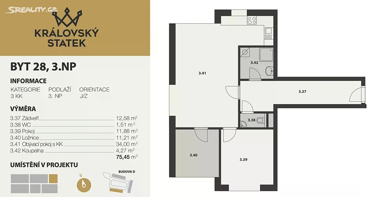 Nabízíme Vám k prodeji byt C28 v novostavbě bytového domu projektu Královský statek v obci Karlštejn. Dům C je momentálně ve výstavbě. Fotky interiéru jsou ilustrační z identické budovy D projektu, který je nyní ve fázi před kolaudací. Byt C28 je dispozičně řešený jako 3+kk ve výměře 75,45 m2 a nachází se v 3.NP objektu C, který je momentálně ve výstavbě. Termín nastěhování je naplánovaný na první čtvrtletí roku 2027. K bytu je možné zakoupit venkovní parkovací stání a sklep. Vytápění a ohřev vody jsou řešeny centrálně plynovým kotlem z kotelny umístěné v přízemí domu. V domě je výtah. Projekt je umístěn v krátké docházkové vzdálenosti k vlakové stanici, z níž se pohodlně dostanete do Prahy na Smíchovské nádraží za 33 minut. Vlaky jezdí denně každou půlhodinu. V obci je veškerá občanská vybavenost - mateřská a základní škola, městský úřad, pošta, muzea, restaurace, kavárny. Je zde možnost sportovního vyžití - fotbalové hřiště, tenisové kurty, cyklostezka, turistické trasy.