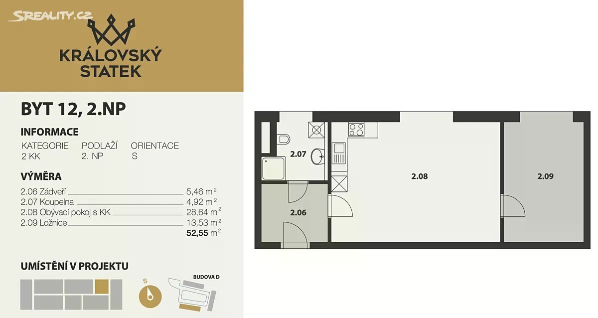 Byt C14 je dispozičně řešený jako 2+kk ve výměře 55,37 m2 a nachází se v 2.NP objektu C, který je momentálně ve fázi výstavby. Z bytu je výhled do zeleně. Termín nastěhování je naplánovaný na první čtvrtletí roku 2027. K bytu je možné zakoupit venkovní parkovací stání a sklep. Vytápění a ohřev vody jsou řešeny centrálně plynovým kotlem z kotelny umístěné v přízemí domu. V domě je výtah. Projekt je umístěn v krátké docházkové vzdálenosti k vlakové stanici, z níž se pohodlně dostanete do Prahy na Smíchovské nádraží za 33 minut. Vlaky jezdí denně každou půlhodinu. V obci je veškerá občanská vybavenost - mateřská a základní škola, městský úřad, pošta, muzea, restaurace, kavárny. Je zde možnost sportovního vyžití - fotbalové hřiště, tenisové kurty, cyklostezka, turistické trasy.