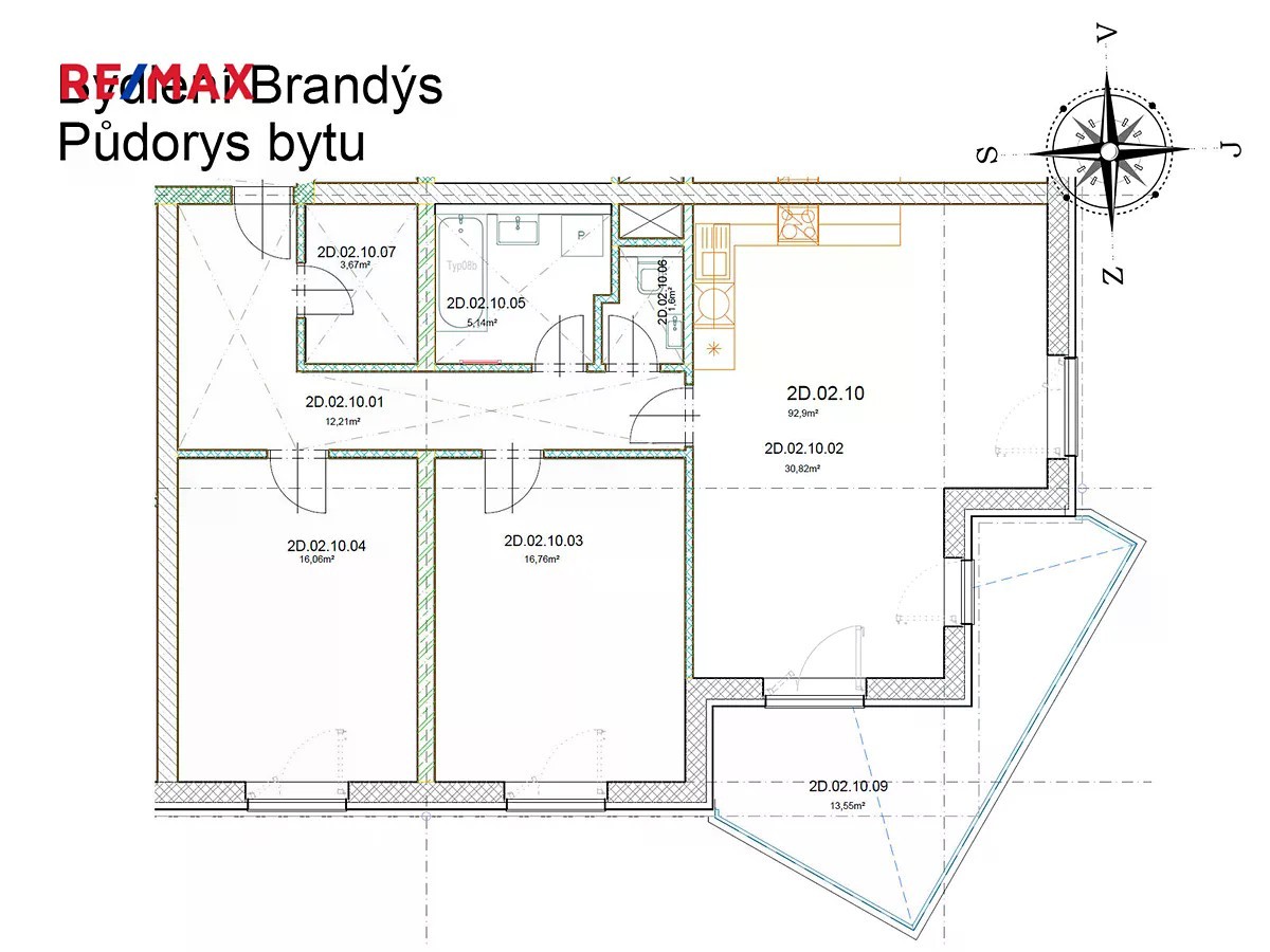 Nabízíme Vám k prodeji nový slunný, prostorný byt s terasou a parkováním v ceně/ novostavba z projektu " Bydlení Brandýs", umístěný v budově "D" ve 2NP, v dispozici 3+kk o výměře 93 m2 + terasa 14m2 + sklepní kóje 3m2 + vnitřní parkovací stání. ul. Augustýna Lukeše 2708d, Brandýs nad Labem. Vše v ceně bytu! Zkolaudováno a bydlení od 09/2024. Aktuální kompletní nabídku bytových jednotek, které jsou momentálně k dispozici najdete na bydleni-brandys. Tento byt je součástí nového developerský projektu „ Bydlení Brandýs“, který se nachází v těsné blízkosti centra města při ulici Augustýna Lukeše a byl navržen jako soubor sedmi bytových domů o čtyřech nadzemních a jednom podzemním podlaží s výtahem. Celkem 302 bytových jednotek je v dispozicích 1+kk, 2+kk a 3+kk a mají rozlohu od 25 m² do 98 m². Většina bytů má balkón, terasu či předzahrádku. V ceně každého bytu je sklep a u bytů větších jak 34m2 přiřazené podzemní garážové stání, garáž a nebo venkovní vyhrazené parkovací stání. Každá sekce domu má samostatný vchod, schodiště, výtah a vjezd ke podzemním garážovým stáním. Je zde veškerá občanská vybavenost, bohatý kulturní společenský život a blízkosti města příroda. Díky dobré dopravní dostupnosti do zaměstnání jak do Prahy, tak i Mladé Boleslavi, možnostem péče o děti, dostatečné kapacitě vzdělání v základních i středních školách, řadě příležitostí k využití volného času, sportovních zařízení, aktivit v přírodě, je město předurčeno ke kvalitnímu životu rodin i jednotlivců.