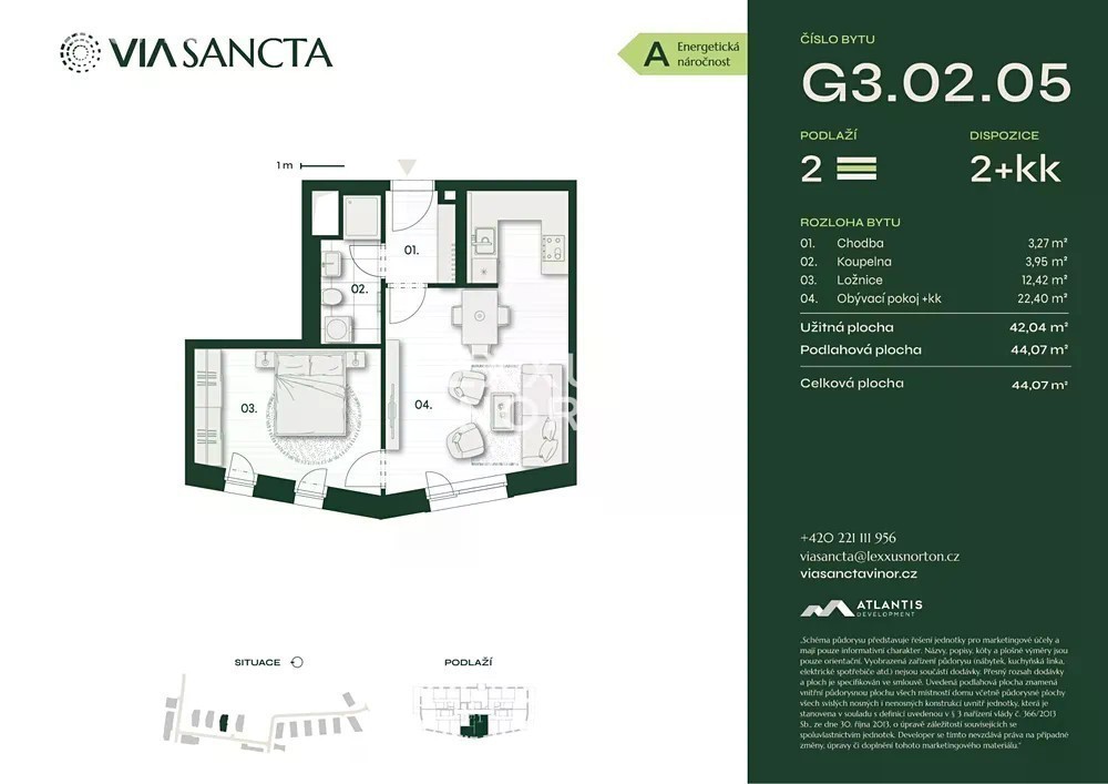 Tento stylový byt 2+kk o ploše 44,77 m² se nachází v klidné části pražské Vinoře a nabízí moderní bydlení v příjemném prostředí. Největším benefitem je prostorný obytný prostor s kuchyňským koutem. Dispozici dále tvoří vstupní chodba s místem pro úložné prvky, ložnice a koupelna se sprchovým koutem. Komfort doplňuje sklepní kóje a možnost garážového či venkovního parkování. Projekt Via Sancta představuje nový standard bydlení. Spojuje moderní architekturu a špičkové technologie s důrazem na udržitelnost. Nabízí širokou škálu bytů od 1+kk po prostorné 4+kk, všechny s balkónem, terasou nebo předzahrádkou. Moderní technologie zahrnují rekuperační systémy, retenční nádrže, tepelná čerpadla a přípravu pro instalaci fotovoltaických panelů, které dohromady zajišťují energetickou úspornost a zvyšují komfort bydlení. Byty jsou navíc vybaveny chytrými domácími systémy, které umožňují efektivní řízení spotřeby energie a zajišťují pohodlí rezidentů. Via Sancta je vhodná pro všechny generace. Areál je obklopen zelení s dětskými hřišti a sportovišti. Okolní prostředí láká k aktivnímu odpočinku s golfovým hřištěm a cyklostezkou v těsné blízkosti komplexu. Komerční prostory přímo v areálu poskytují potřebné služby, což činí z Via Sancta ideální místo pro moderní život. Byt bude dokončen ve vysokém standardu, jakou jsou dřevěné třívrstvé podlahy, velkoformátové obklady italských značek, vybavení koupelen značky Vileroy & Bosh a Grohe, bezpečnostní vstupní dveře nebo dřevo-hliníková okna s izolačními trojskly s přípravou pro instalaci venkovních žaluzií. Podlahové vytápění a chlazení udržují ideální teplotu v každé místnosti po celý rok. Rekuperace zajišťuje kontrolované větrání a přívod čerstvého vzduchu. Chytrá domácnost KNX umožňuje ovládání osvětlení, žaluzií a teploty pomocí chytrých tlačítek nebo mobilní aplikace. Vinoř je klidná a malebná část Prahy 9, která skvěle kombinuje blízkost k přírodě s městskou vybaveností. Je známá svými historickými památkami i rozsáhlými přírodními oblastmi, včetně Vinořského přírodního parku a Ctěnického háje. Pro rodiny i jednotlivce je dostupná kompletní občanská vybavenost včetně škol, školek, obchodů a sportovních zařízení. Díky vynikající dopravní infrastruktuře je centrum Prahy snadno dostupné. Cesta autem trvá asi 20 minut, zatímco pravidelným autobusovým spojením se dostanete na metro Letňany za 10 minut. Vinoř je tak ideálním místem pro ty, kdo hledají klidné bydlení s rychlým přístupem k městským výhodám.