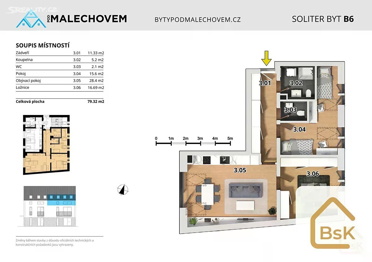 Nabízíme k prodeji prostorný a elegantně řešený podkrovní byt 3+kk o celkové ploše 79,32 m², umístěný ve 3. nadzemním podlaží komorního domu Soliter v rámci moderního rezidenčního projektu Pod Malechovem v Českém Brodě. Tento byt nabízí klidné a stylové bydlení s příjemnými výhledy a dostatkem denního světla - ideální volba pro rodinu, pár i jednotlivce hledající originální prostor k životu. Byt disponuje vstupní chodbou (11,33 m²), nabízející místo pro úložné prvky, a přístupem do samostatné toalety (2,1 m²) a koupelny (5,2 m²). Dále jsou zde dvě prostorné neprůchozí místnosti - ložnice (16,69 m²) a pokoj (15,6 m²) vhodný např. pro dítě, pracovnu nebo hosty. Dominantou bytu je velkorysý obývací pokoj s kuchyňským koutem (28,4 m²), který díky podkrovnímu charakteru působí velmi vzdušně a útulně zároveň. Vysoké stropy a šikmé stěny dodávají prostoru charakter a jedinečnou atmosféru. Byt bude dokončen ve vysokém developerském standardu - vinylové podlahy, keramické obklady, moderní sanita a interiérové dveře. Kuchyňská linka není součástí vybavení - můžete si ji tedy navrhnout zcela podle svých představ. Pokud si byt zarezervujete včas, máte možnost provést klientské změny, a přizpůsobit si tak nový domov na míru. Rezidence Pod Malechovem se nachází v tiché části města, pouhých pár minut pěšky od centra Českého Brodu i vlakového nádraží. Do Prahy se dostanete pohodlně za cca 30 minut přímým vlakem, autem po dálnici D11 asi za 25 minut. V místě najdete kompletní občanskou vybavenost: obchody, školy, školky, lékaře, restaurace i sportoviště. K bytu je možné dokoupit podzemní garážové stání, venkovní parkovací místo nebo sklepní kóji, které zajistí pohodlí i dostatek úložného prostoru pro každodenní potřeby. Pomůžeme Vám zajistit výhodné financování prostřednictvím naší hypoteční specialistky Lucie Berkové - bez poplatků a s kompletním servisem od výběru banky až po vyřízení podkladů. Samozřejmostí je bezpečný právní servis a úschova kupní ceny. V případě zájmu o osobní prohlídku nás neváhejte kontaktovat - rádi Vám byt představíme a zodpovíme veškeré dotazy.