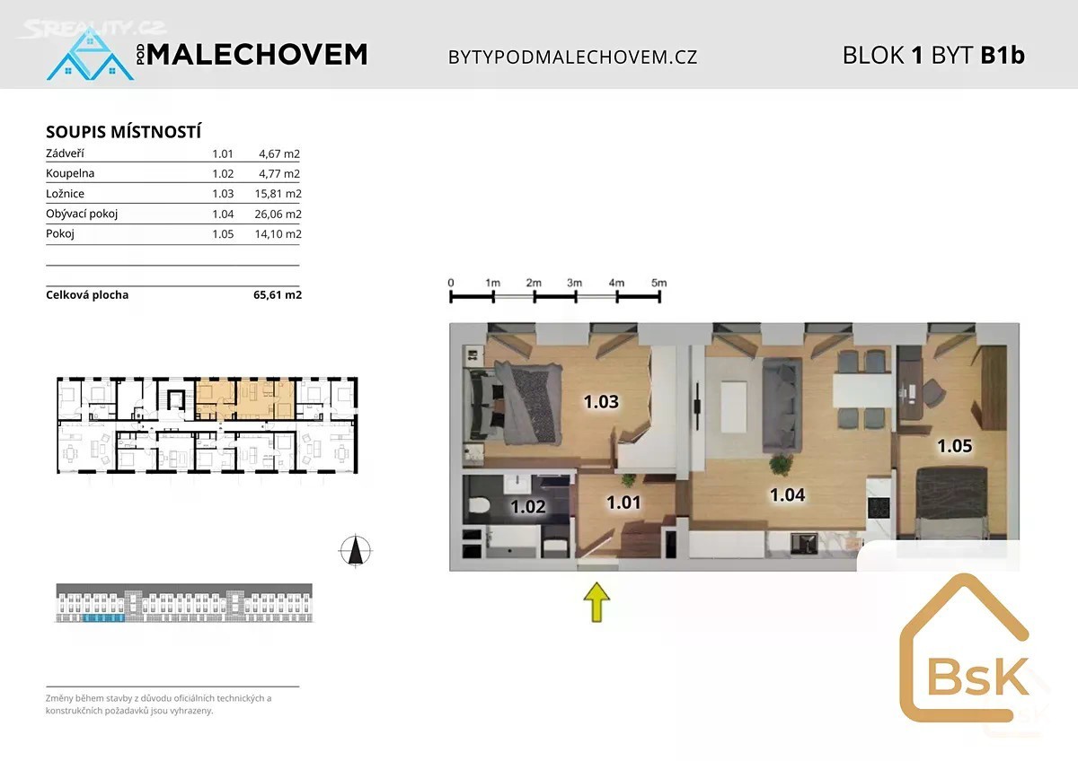 Nabízíme k prodeji moderně řešený byt 3+kk o celkové výměře 65,61 m², nacházející se v 1. nadzemním podlaží domu Blok 1 v rámci rezidenčního projektu Pod Malechovem v Českém Brodě. Byt je ideální volbou pro rodinu, pár nebo jednotlivce, hledající pohodové bydlení v klidné lokalitě s výbornou dostupností do Prahy. Byt se skládá ze vstupního zádveří (4,67 m²), koupelny (4,77 m²) a dvou samostatných pokojů - ložnice (15,81 m²) a pokoj (14,10 m²), který může sloužit jako dětský pokoj, pracovna nebo pokoj pro hosty. Dominantou bytu je světlý obývací pokoj s kuchyňským koutem o výměře 26,06 m², poskytující dostatek prostoru pro každodenní život, relaxaci i společné chvíle s rodinou. Díky velkým oknům působí interiér příjemně prosvětleně a vzdušně. Byt bude dokončen ve vysokém standardu - vinylové podlahy, keramické obklady, sanita (vana/sprcha, umyvadlo, WC) a interiérové dveře jsou samozřejmostí. Kuchyňskou linku si můžete zařídit podle vlastních představ. Při včasné rezervaci je možné využít klientské změny, a přizpůsobit si tak byt na míru svým potřebám. Projekt Pod Malechovem se nachází v klidné a zelené části Českého Brodu, přitom jen pár minut od centra města a vlakového nádraží. Díky přímému železničnímu spojení jste do 30 minut v centru Prahy, autem se pohodlně napojíte na dálnici D11. Český Brod nabízí kompletní občanskou vybavenost - školy, školky, obchody, zdravotnická zařízení, restaurace i sportoviště. Pro ještě větší komfort je možné k bytu přikoupit garážové stání. Pomůžeme Vám zajistit výhodné financování prostřednictvím naší hypoteční specialistky Lucie Berkové - bez poplatků a s kompletním servisem od výběru banky až po vyřízení podkladů. Samozřejmostí je bezpečný právní servis a úschova kupní ceny. V případě zájmu o osobní prohlídku nás neváhejte kontaktovat - rádi Vám byt představíme a zodpovíme veškeré dotazy.