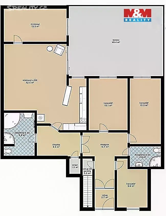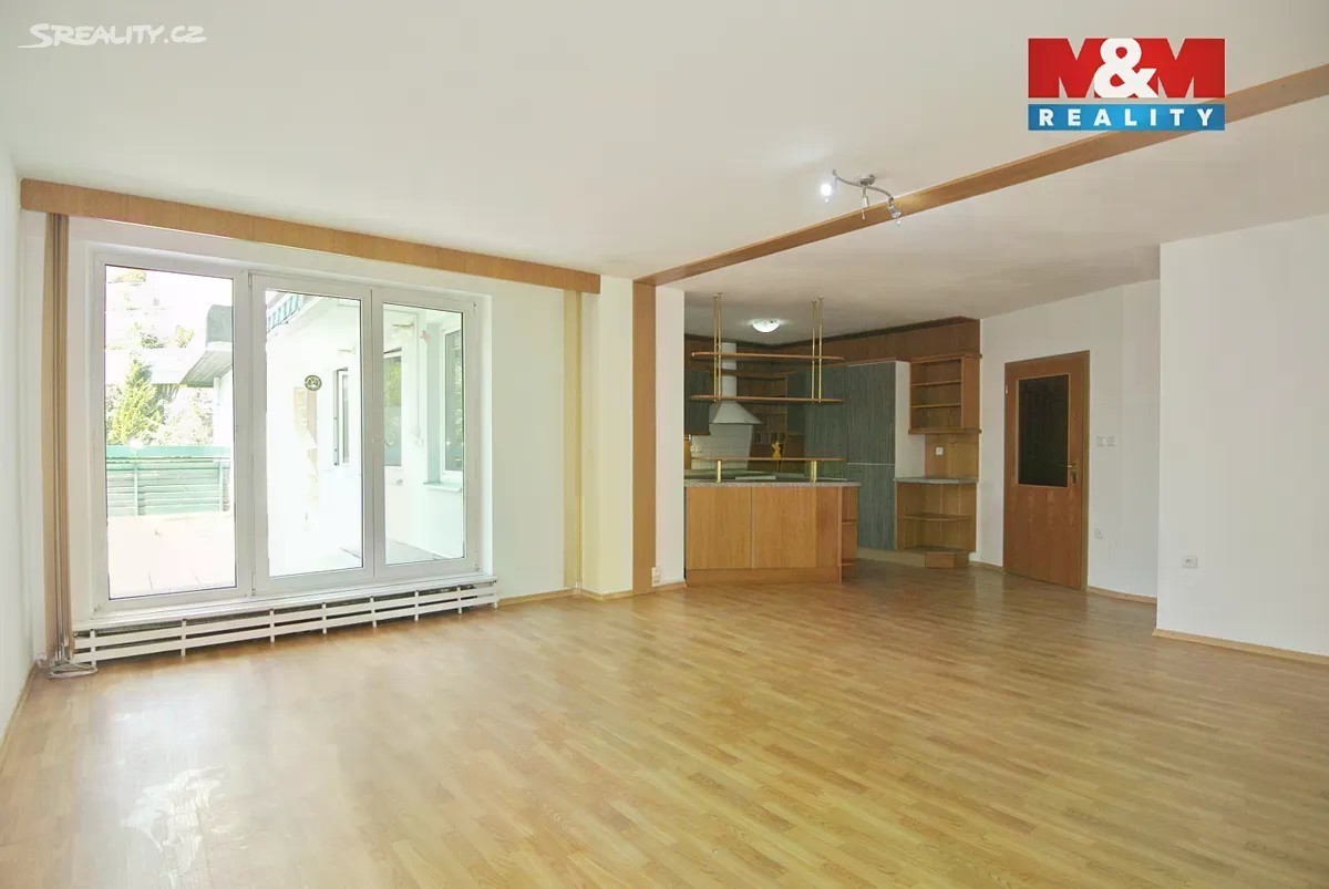 Prodej nadstandardně prostorného bytu 5+kk 140m2 s terasou (50 m²), garážovým stáním (14,5m2) a samostatným vchodem z ulice mimo společné prostory domu. Ideální nemovitost pro větší rodinu. Vstup do bytu je bezbariérový přímo z ulice od parkoviště před domem a také přímo z garážového stání. Byt se skládá ze vstupní haly, ze které se vchází do tří samostatných neprůchozích pokojů a dále do prostorného obývacího pokoje s kuchyňským koutem a vstupem na terasu. Z prostorného obývacího pokoje je přístup do čtvrtého neprůchozího pokoje. Byt má dvě koupelny, z nichž jedna je vybavena sprchovým koutem, umyvadlem a toaletou. Druhá koupelna je vybavena vanou, sprchovým koutem a prostorem pro pračku a zároveň je vybavena také bidetem a toaletou. Vytápění a ohřev vody je dálkové. Díky samostatnému vchodu lze v nemovitosti mít i prostor pro podnikání jako masážní salon, advokátní kancelář a podobně.