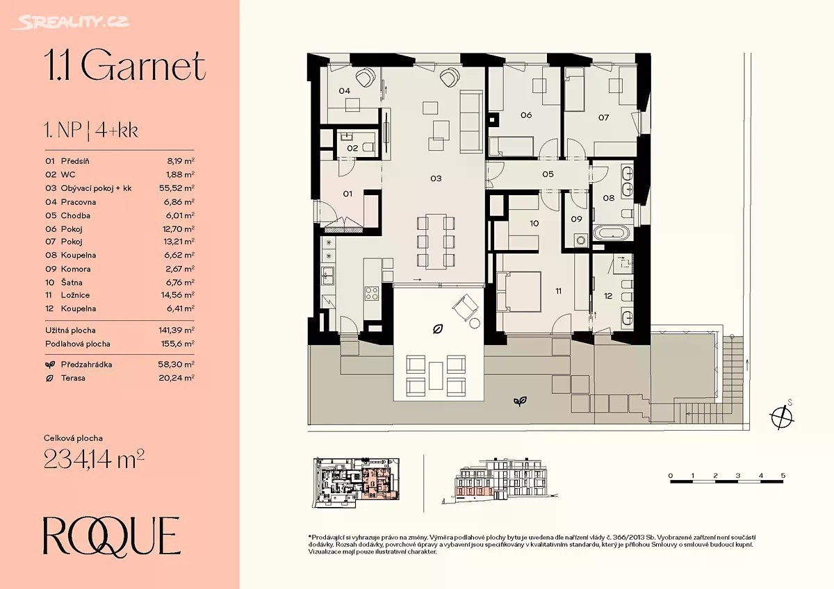 BYT 1.1 GARNET RODINNÝ BYT SE ZAHRADOU V prvním nadzemním podlaží Vily ROQUE se rozkládá na ploše 234,14 m2 velkorysý rodinný byt 1.1 GARNET (4-5 + kk). Nabízí severojižně orientovaný velký obývací pokoj se zázemím pro pracovnu orientovaným na sever a kuchyní orientovanou na jih. Celková velikost tohoto obývacího prostoru je 62 m2 a navazuje na něj příjemná částečně krytá terasa o výměře 20,24 m2 se zahradou velikosti 58 m2. Ze zahrady je umožněn soukromý přístup po schodech k vjezdu do garáží. Master bedroom se šatnou a koupelnou doplňují dva pokoje s koupelnou jako stvořené pro dětské obyvatele bytu. Nechybí zázemí pro pračku, sušičku či samostatné WC. K bytu náleží dvě parkovací stání a prostorný sklep jako další úložný prostor v 1. PP domu. K neodmyslitelnému standardu patří podlahové topení, chlazené stropy, dřevěné třívrstvé podlahy v obytných místnostech a na chodbách, hliníková okna s izolačním trojsklem, velkoformátové obklady a dlažby v koupelnách, stínící technika, chytrá domácnost, centrální větrání s rekuperací a mnoho dalšího. Zdrojem tepla jsou tepelná čerpadla. Podlahová plocha: 155 m2; terasa 20 m2; soukromá zahrada 58 m2. PROJEKT VILA ROQUE Vybroušený originál Vila ROQUE o šesti výjimečných bytech vznikne ve stávající břevnovské zástavbě mezi parkem Ladronka a břevnovským klášterem v ulici Šultysova. Dvě plnohodnotná nadzemní a dvě ustupující podlaží domu navazují svým vzhledem na charakter řadových i solitérních vil v okolí. Návrh domu vzešel od renomované architektonické kanceláře Podlipný Sladký architekti a využití venkovních pobytových ploch a zahrad nese rukopis profesionálních a zkušených zahradních architektů z ateliéru Flera. Šest velkorysých bytových jednotek o rozloze 150 až 260 m2, je koncipováno jako prémiové městské bydlení. Ke každé jednotce náleží minimálně dvě parkovací stání v podzemní garáži domu. Propojení interiéru s exteriérem akcentují u přízemních bytů vlastní zahrady, u bytů ve vyšších patrech pak lodžie či terasy. Standard domu odpovídá vysokým nárokům na úroveň bydlení, které propisujeme do každého realizovaného projektu. Nechybí proto tepelná čerpadla, podlahové vytápění, chlazené stropy, stínící technika, velkoformátové obklady, nadstandardní sanita, třívrstvé dřevěné podlahy, hliníková okna s izolačním trojsklem, chytrá domácnost a další. Bydlení ve vile ROQUE je určeno všem, kteří ocení výjimečné městské bydlení a zároveň hledají klid, relaxaci i aktivní formu odpočinku v blízkosti parků a zelených ploch.