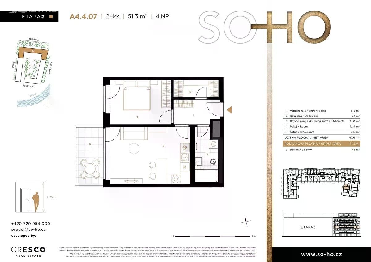 Světlý byt 2+kk (51,3 m²) s balkonem (7,3 m²) se nachází ve 4. nadzemním podlaží moderní novostavby 2. etapy SO-HO Rezidence, v atraktivní lokalitě jižních Holešovic. Dispozičně promyšlený byt nabízí prostorný obývací pokoj s přímým vstupem na balkon, který je propojen s kuchyní a jídelní částí, což vytváří ideální zónu pro relaxaci i setkávání s přáteli. Ložnice nabízí dostatek místa pro velkou postel i úložné řešení. Praktická vstupní hala a samostatná komora dále rozšiřují možnosti úložného prostoru. Byt vyniká moderním designem od renomovaného architektonického studia QARTA Architektura, které klade důraz na kvalitu, funkčnost a precizní detaily. Interiér je vybaven prémiovým standardem: dřevěnými celoplošně lepenými podlahami, podlahovým topením, bezfalcovými dveřmi s výškou 2,1 m, velkoformátovými hliníkovými okny s izolačním trojsklem a elektricky ovládanými předokenními screenovými roletami. K bezpečnosti přispívají vstupní dveře 3. bezpečnostní třídy. V koupelně najdete velkoformátové obklady a dlažby a podomítkové baterie. Na přání je možné vybavení bytu nebo jeho dispozici individuálně přizpůsobit v rámci klientských změn. SO-HO Rezidence se nachází v dynamické části Holešovic, která nabízí nejen kvalitní bydlení, ale i širokou občanskou vybavenost. Okolí láká množstvím gastronomických podniků, kaváren, kulturních a uměleckých aktivit - DOX, současné umění, divadelní scény a moderní street art. Milovníci přírody ocení nedalekou Stromovku pro relaxaci a sportovní vyžití. Součástí prodeje je i sklep. Parkovací stání není v ceně, ale je možné ho dokoupit. Projekt je ve výstavbě, předpokládané dokončení je plánováno na 4. čtvrtletí 2026. Prodej probíhá přímo od developera. Více informací o tomto bytě, projektu a aktuální nabídce bytů z 2. etapy najdete na webových stránkách projektu. Rádi vás přivítáme také v našem prodejním centru: Classic 7, Budova C (přízemí), Jankovcova ********* Praha 7.